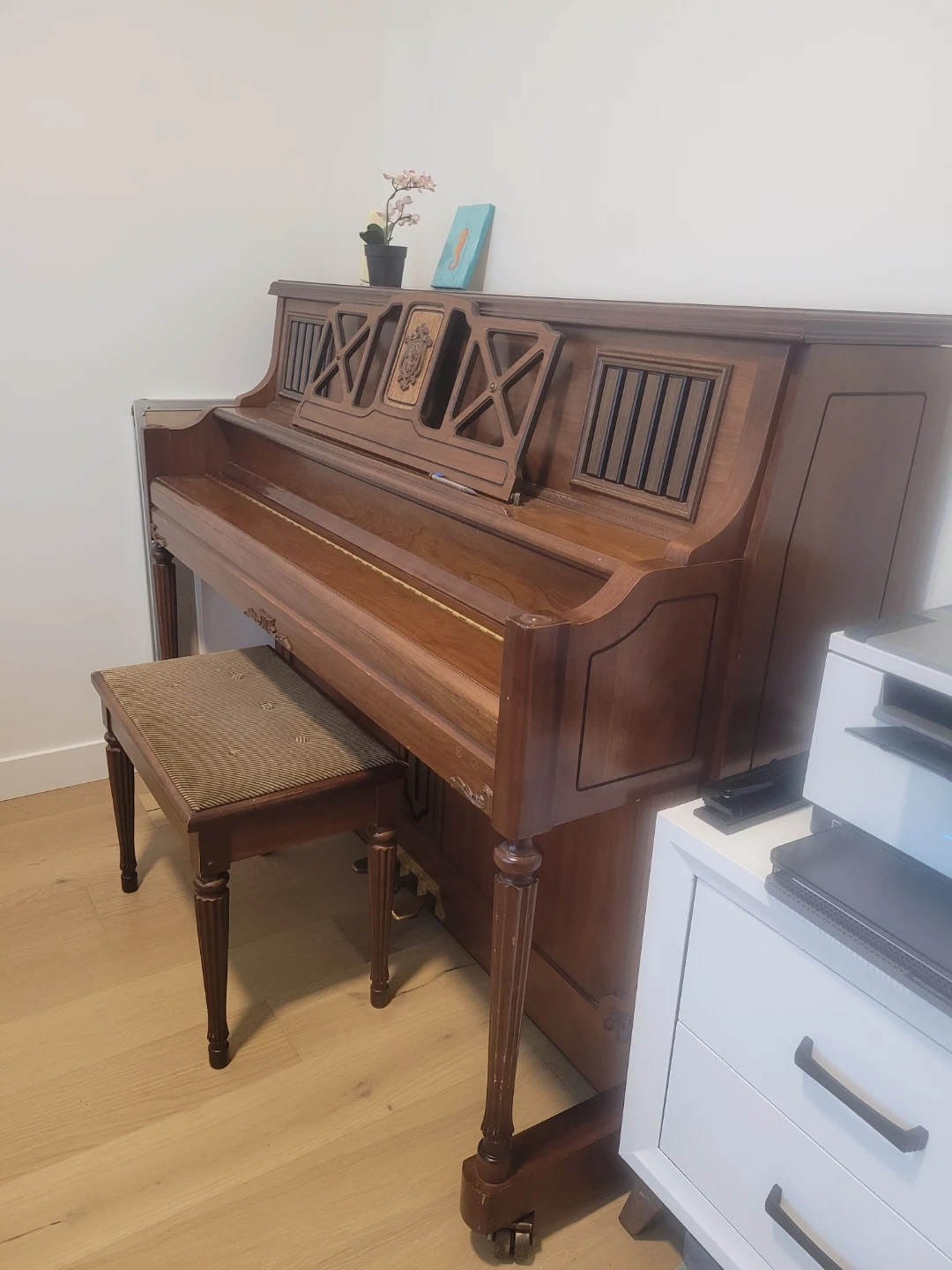 Selling a lovely upright piano that comes with a matching bench! It's a beautiful piece of furniture and a great instrument for anyone looking to learn or continue playing. The piano has a classic design and would look great in any home