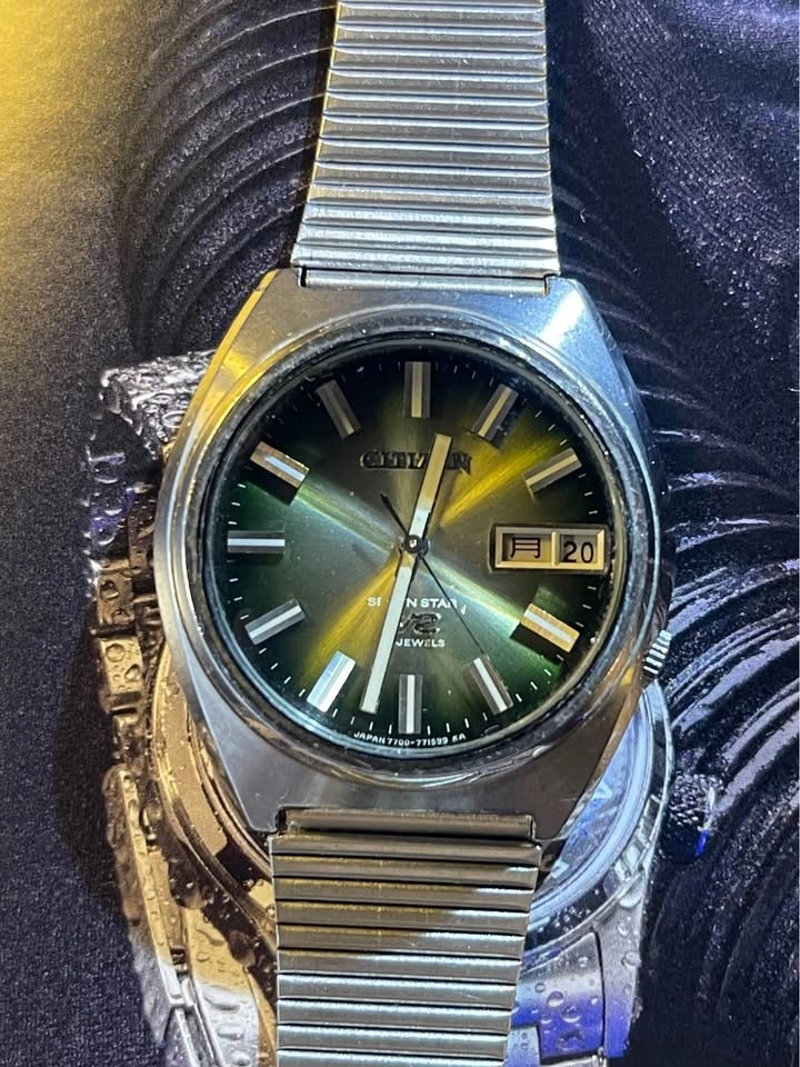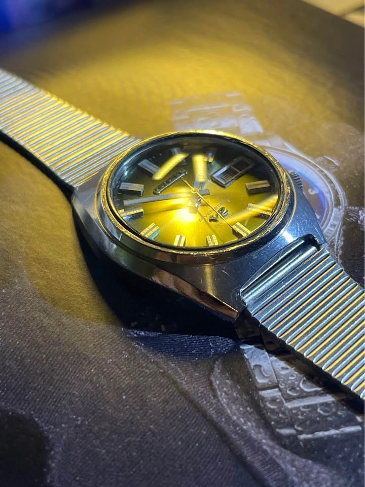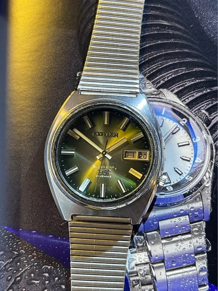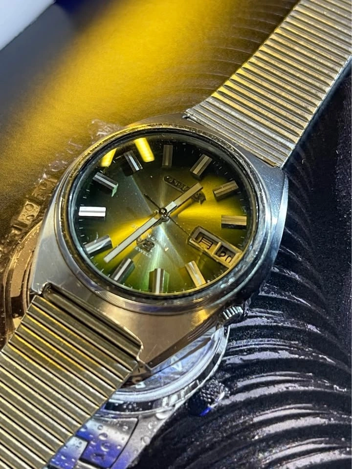 Diameter 39mm, Lug to lug 37.5mm, Lug width 18mm, Thickness 12mm, Domed mineral crystal. Features a 7700 22 jewels automatic movement with handwinding and hacking seconds. The movement keeps great time for its age and includes a bilingual day/date complication (English and Japanese kanji). The movement is healthy, running within +/- 10 seconds a day, which is excellent for a watch over 40 years old. To change the quickset day, press the crown in at the twelve o'clock position. To change the day, use the 6 o'clock position. Please note that water resistance cannot be guaranteed as this is a vintage watch. Pick up only in Whitby near Brock/Taunton. Cash only, no holds.