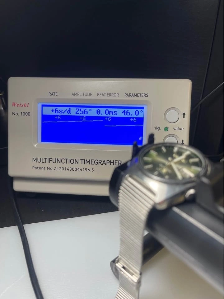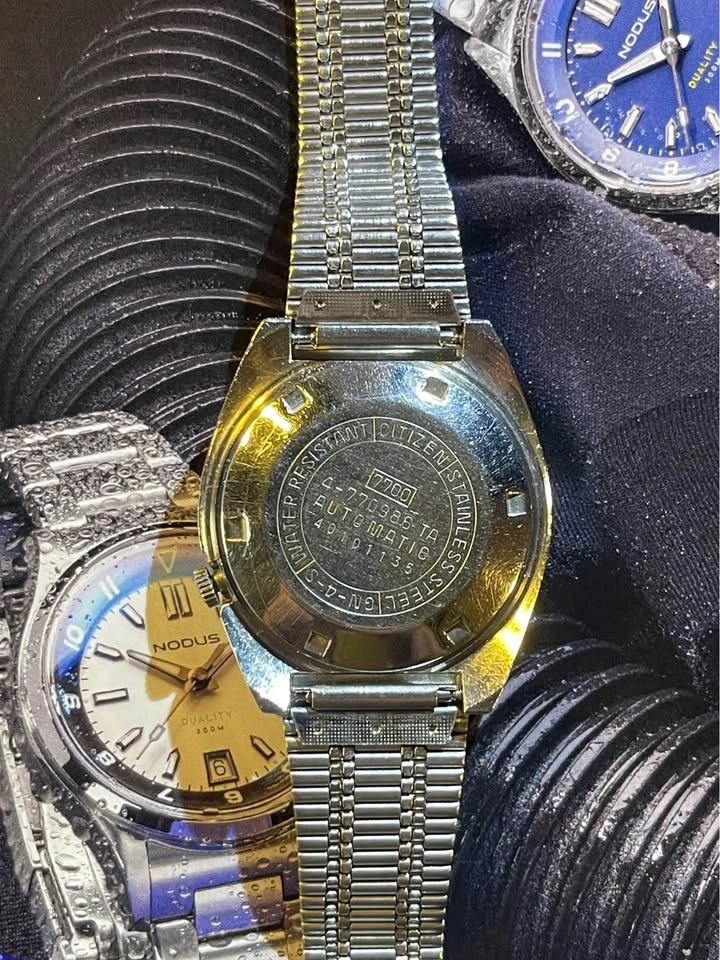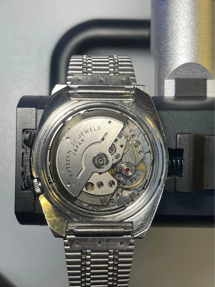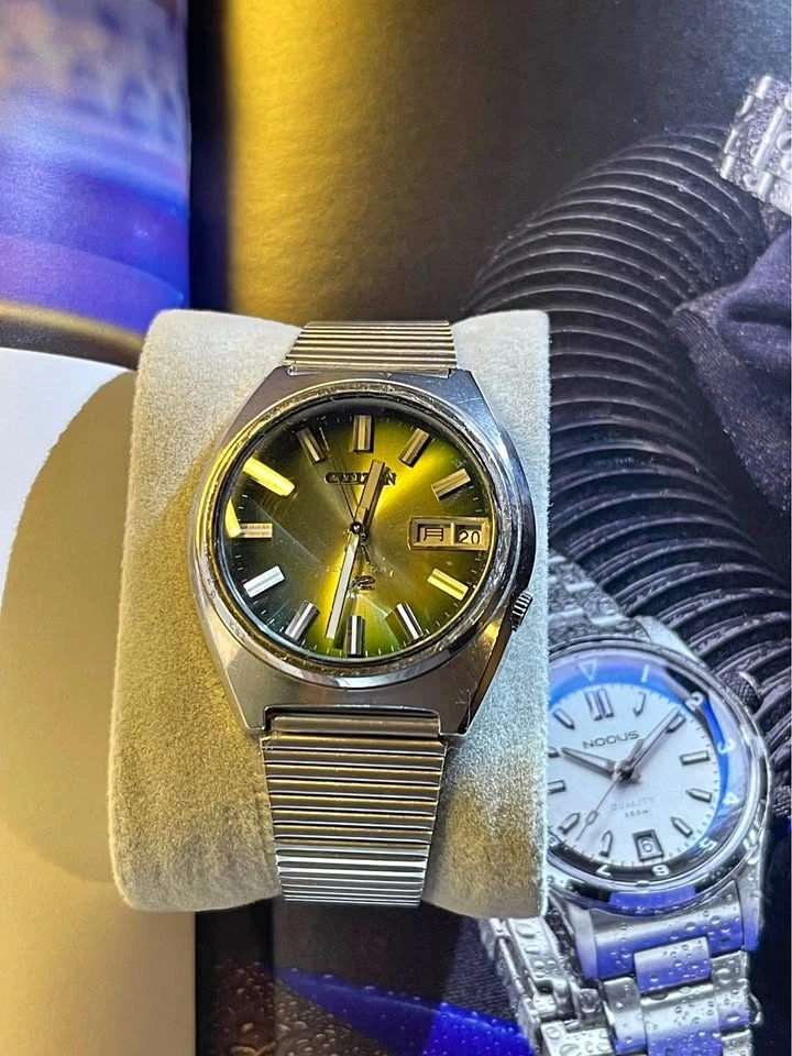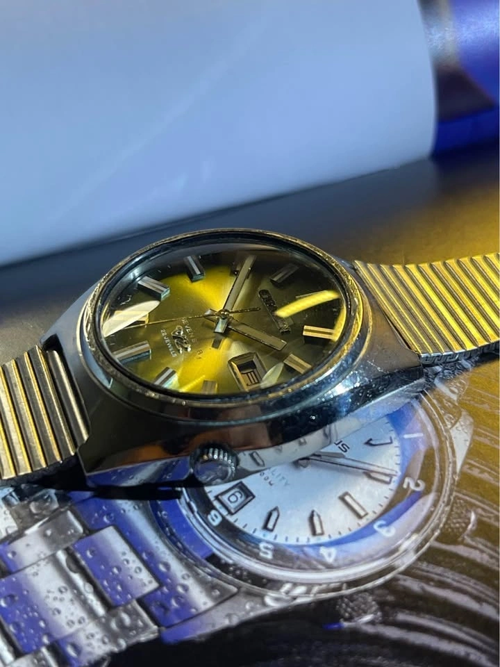 Diameter 39mm, Lug to lug 37.5mm, Lug width 18mm, Thickness 12mm, Domed mineral crystal. Features a 7700 22 jewels automatic movement with handwinding and hacking seconds. The movement keeps great time for its age and includes a bilingual day/date complication (English and Japanese kanji). The movement is healthy, running within +/- 10 seconds a day, which is excellent for a watch over 40 years old. To change the quickset day, press the crown in at the twelve o'clock position. To change the day, use the 6 o'clock position. Please note that water resistance cannot be guaranteed as this is a vintage watch. Pick up only in Whitby near Brock/Taunton. Cash only, no holds.