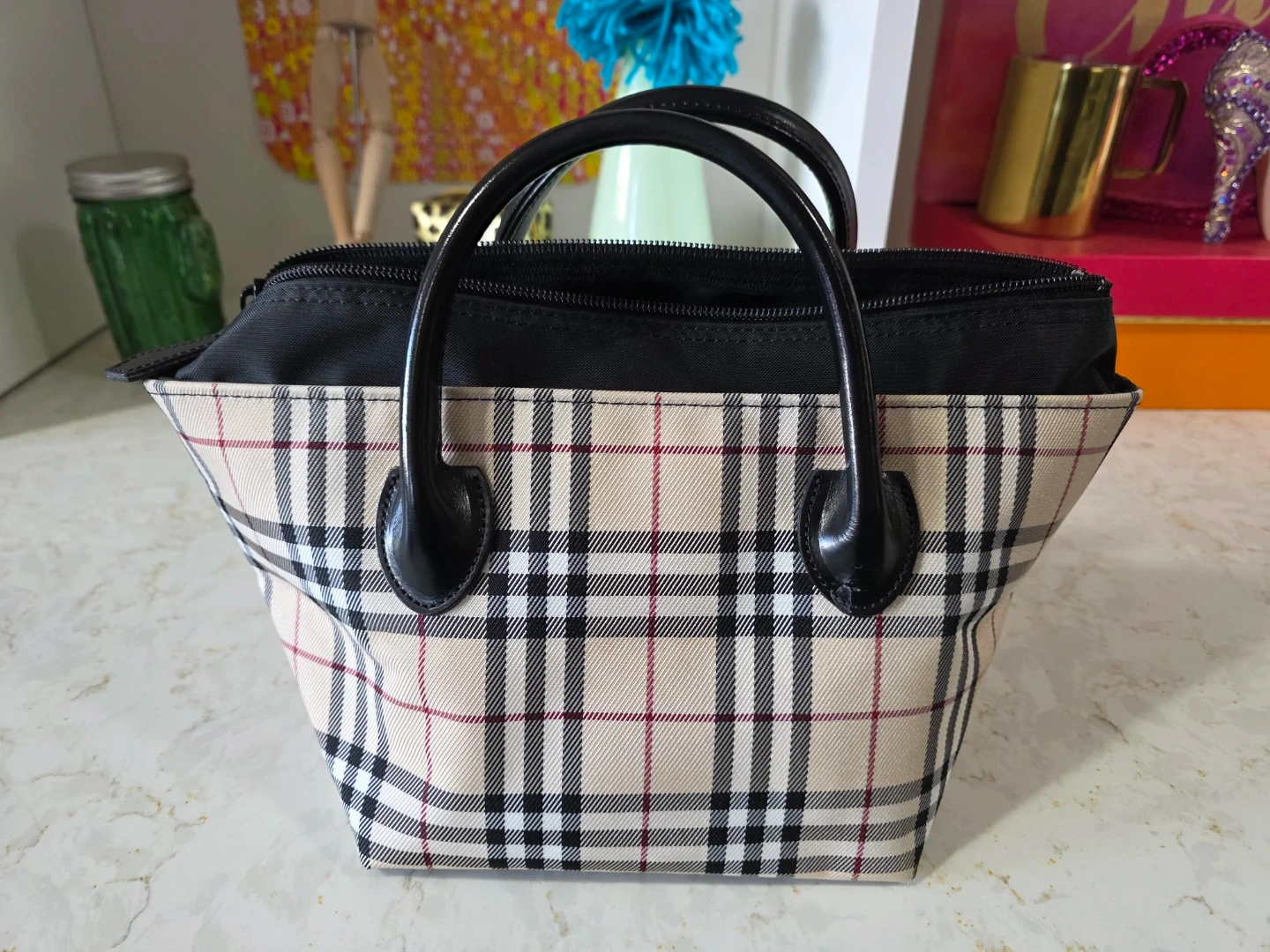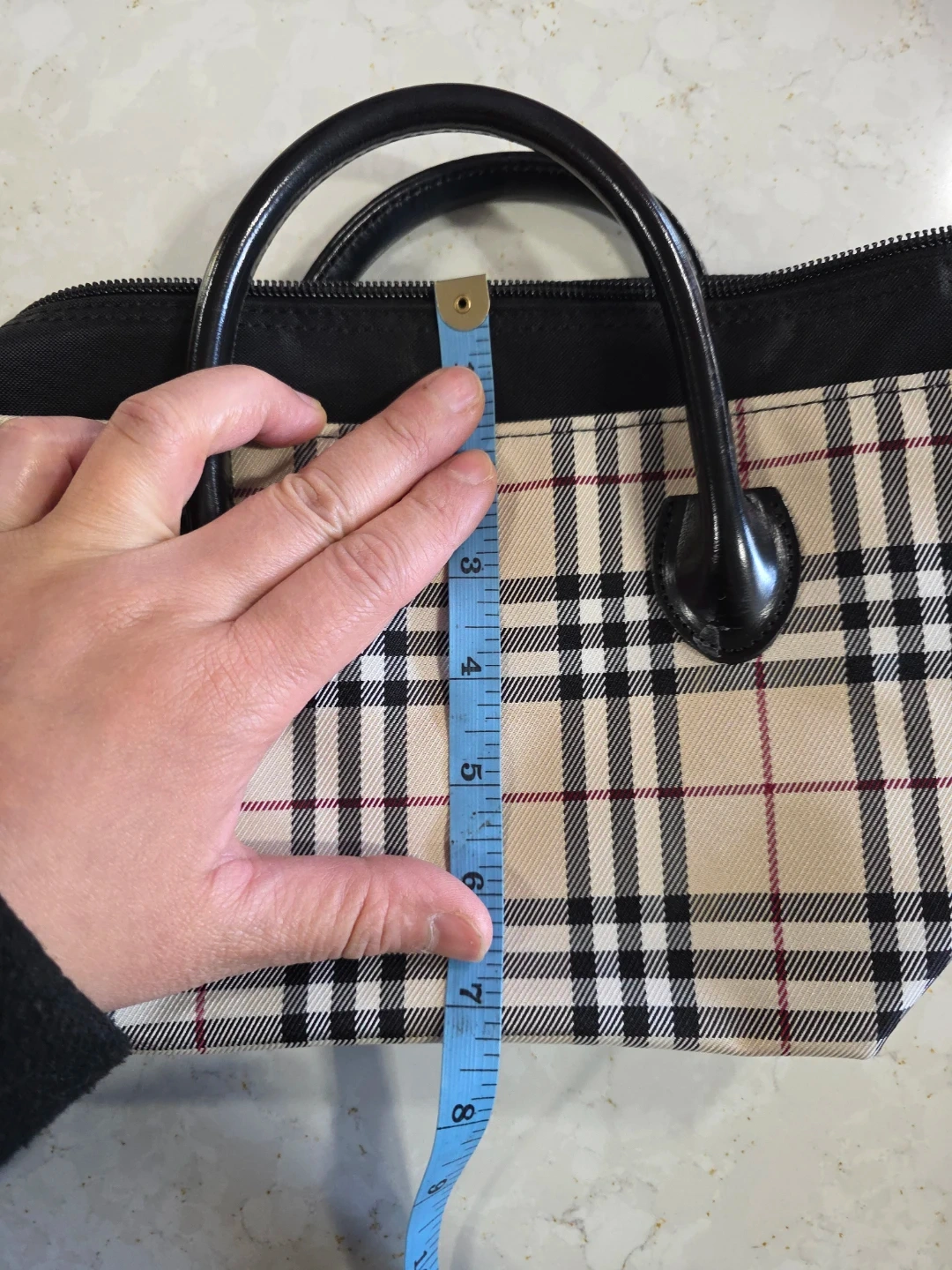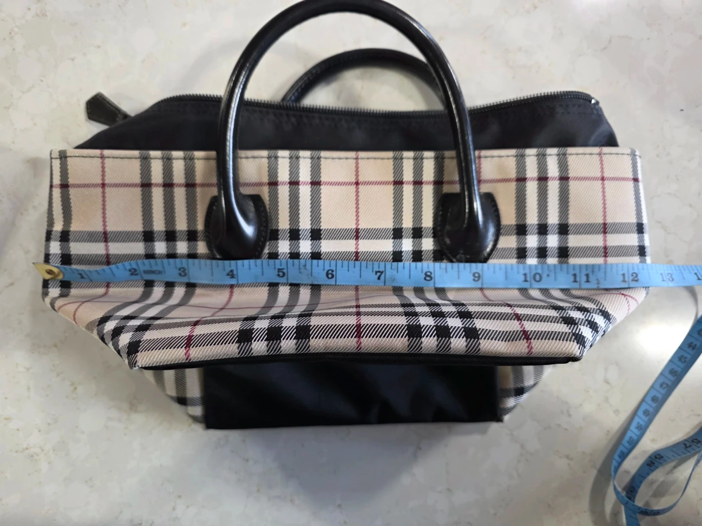 Selling a cute Burberry Blue Label handbag. It has a classic plaid pattern and black handles. It measures approximately 12 inches in length and 7 inches in height. Perfect for everyday use!