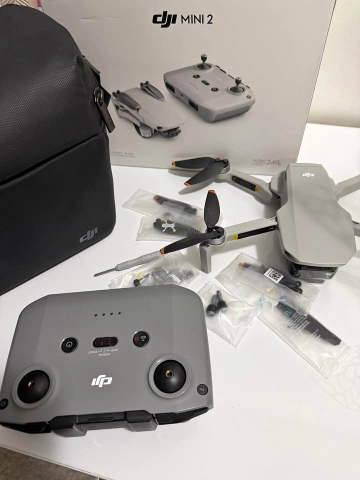 One of the gimbal legs is broken, so the camera sometimes shakes when flying. No other issues. Comes with 3 batteries and hub, 6 extra propellers, 2 extra controller sticks, a carry bag, and a screwdriver.