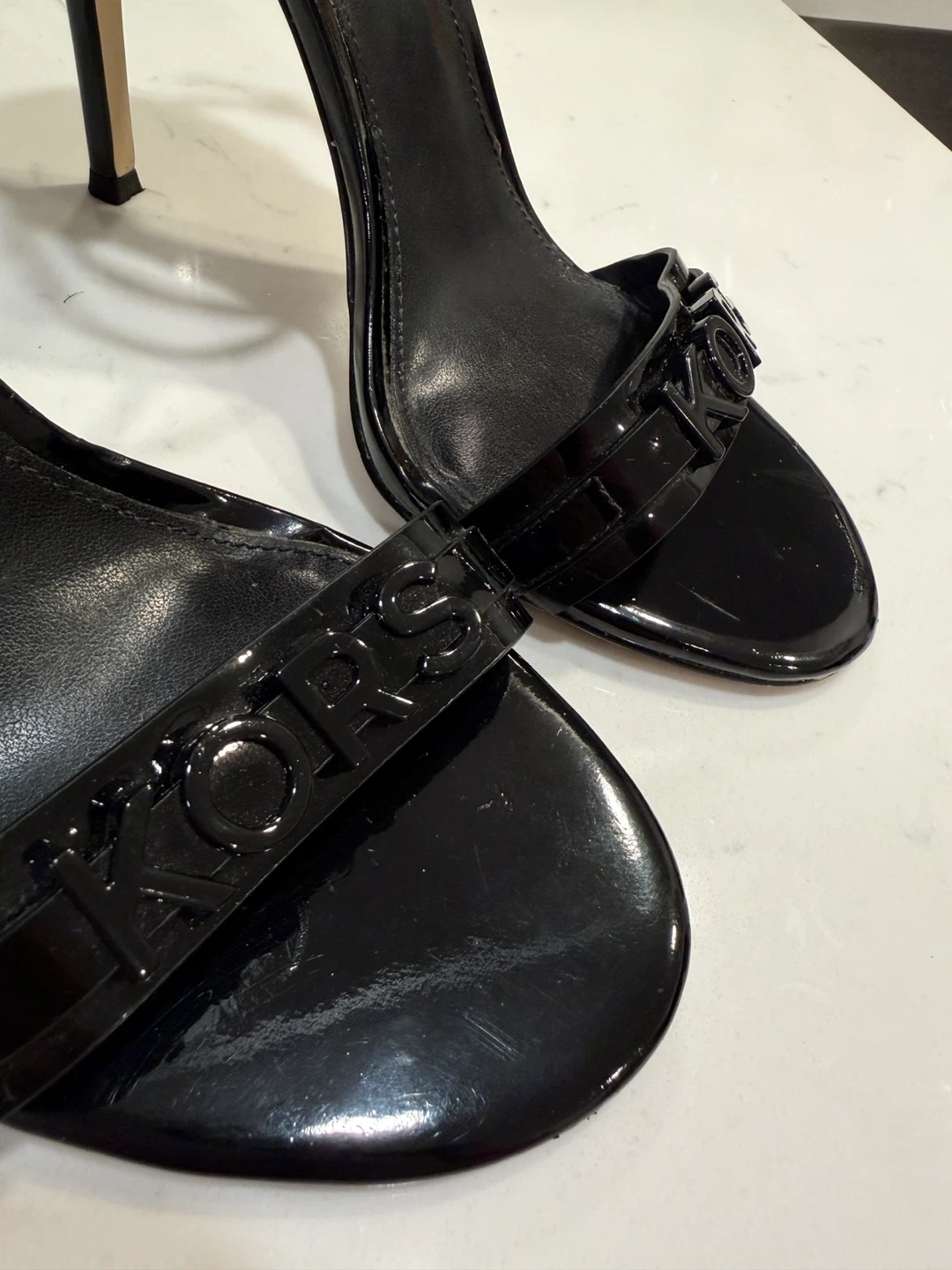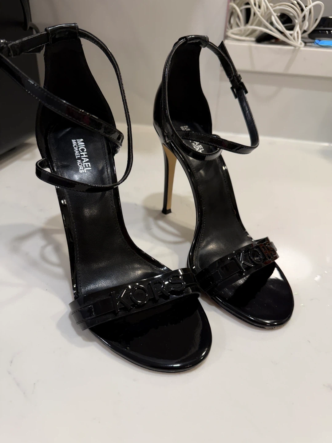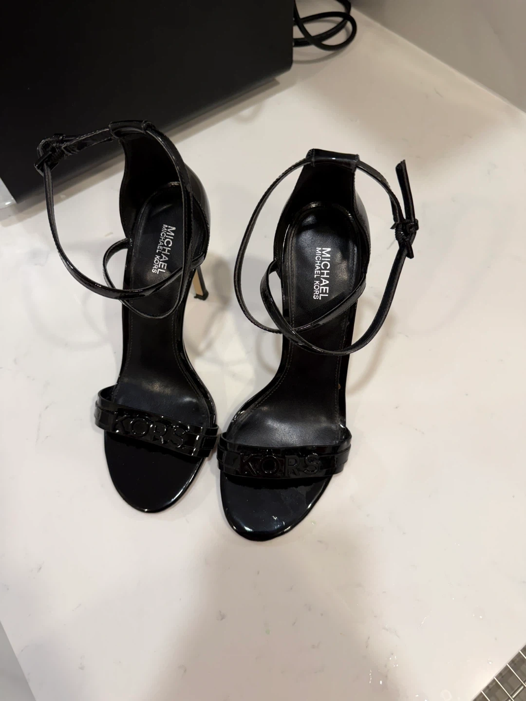 Selling a pair of stylish black Michael Kors heels. These heels are in great condition and would be a fantastic addition to your wardrobe. They feature the MK logo on the front strap. Perfect for a night out or a special occasion! Price negotiable