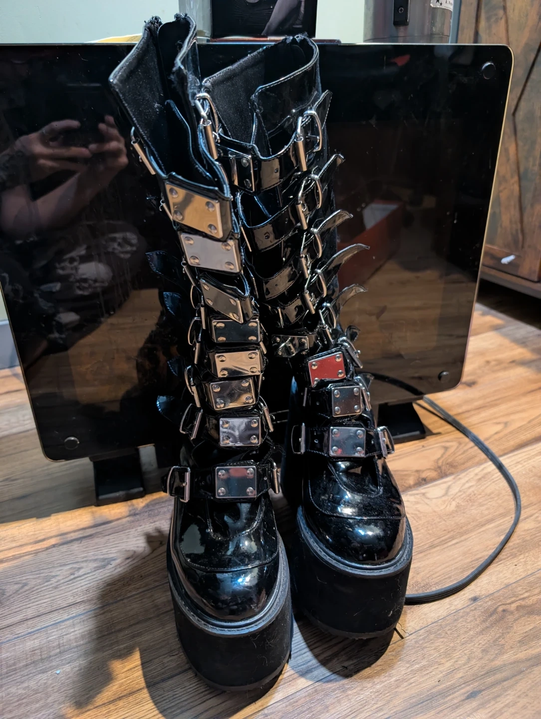 Selling a pair of Demonia platform boots in black, size 10. They feature a lot of buckles and a zipper on the side. Great for a goth or alternative look!