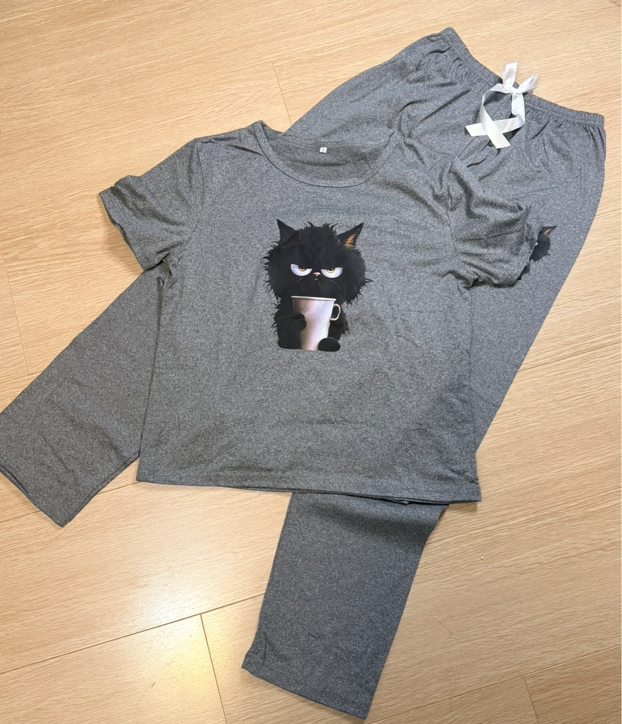 Cute grey pajama set with a grumpy cat print! Includes a t-shirt, long pants, and shorts. Size small and in great condition