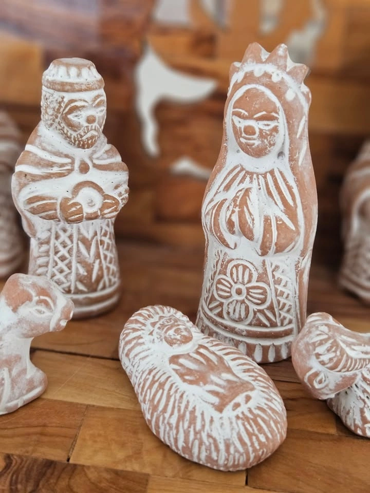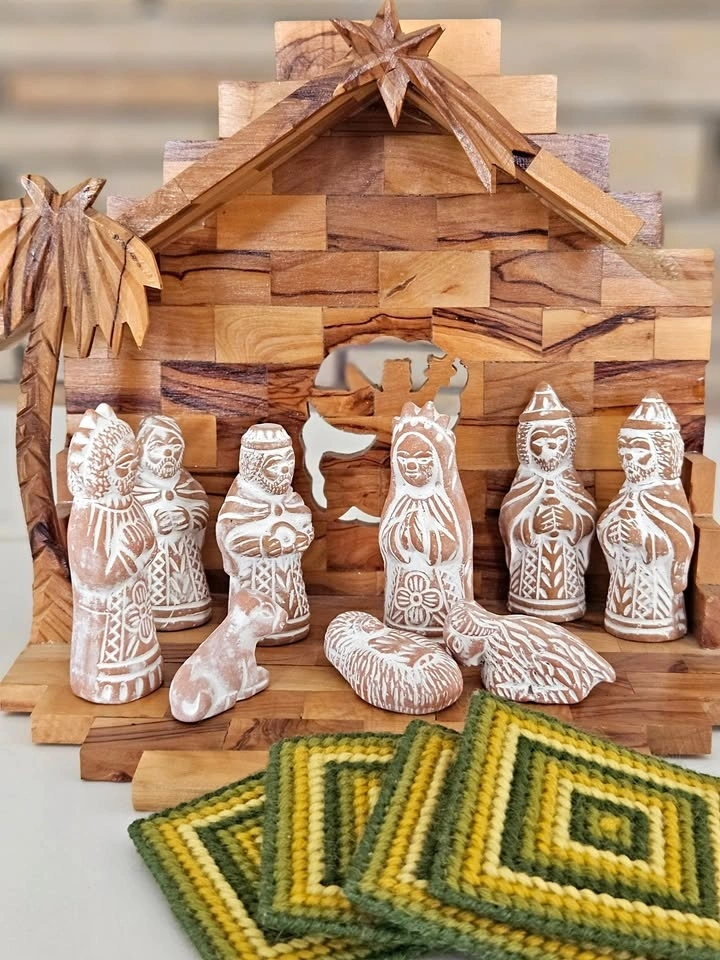 Captivating Handcrafted Terracotta and wooden Nativity Set inspired by Pottery Barn, featuring a tropical theme, has a stunning finish and is ideal for display throughout the year. Perfect for infusing warmth and nostalgia into your holiday decor.