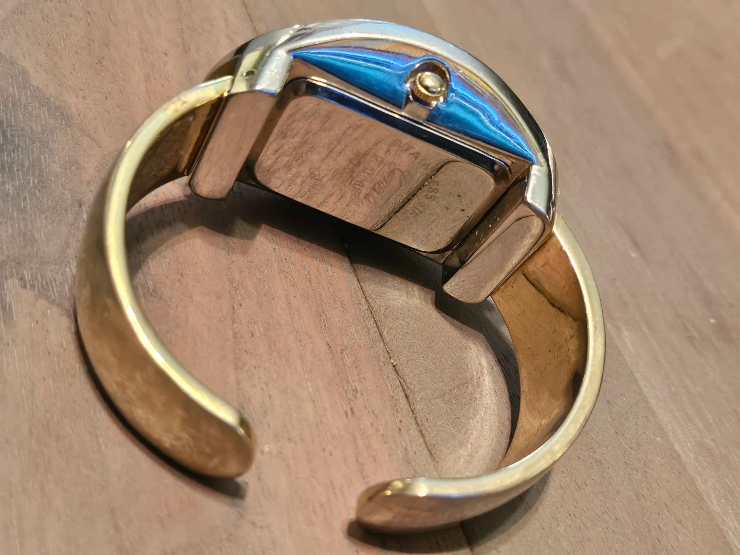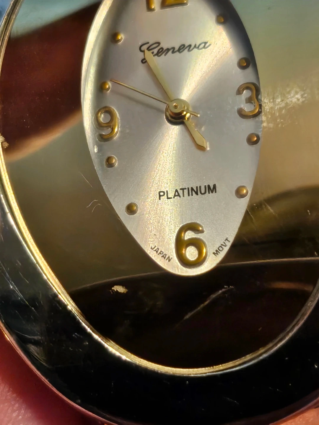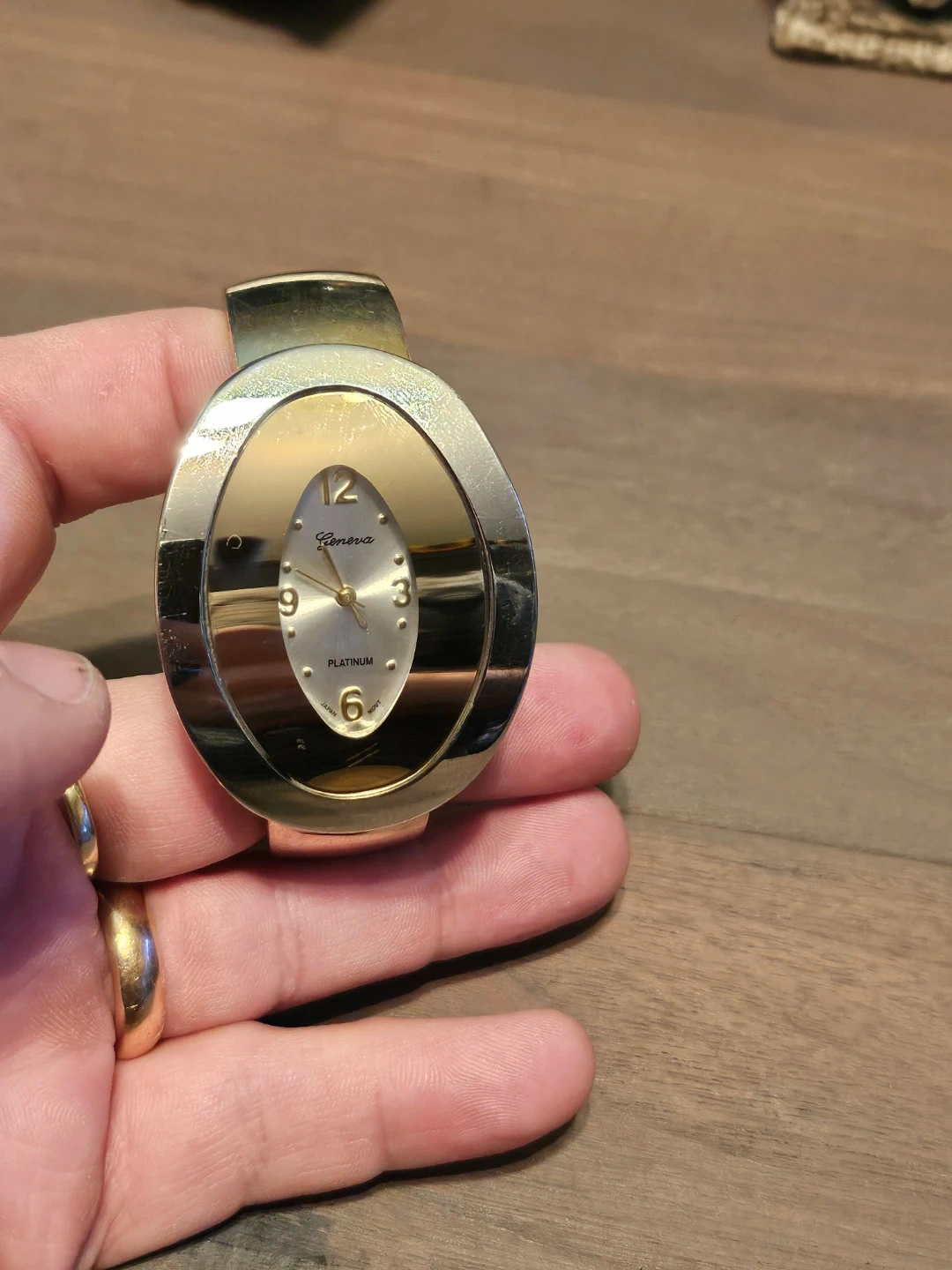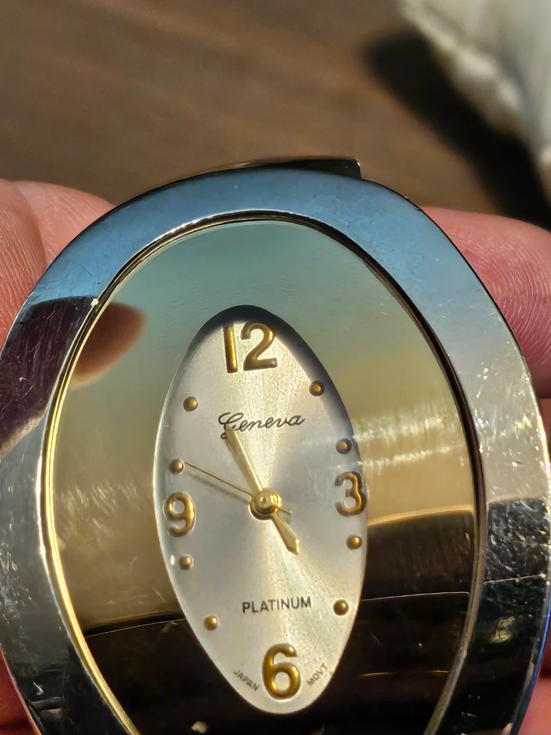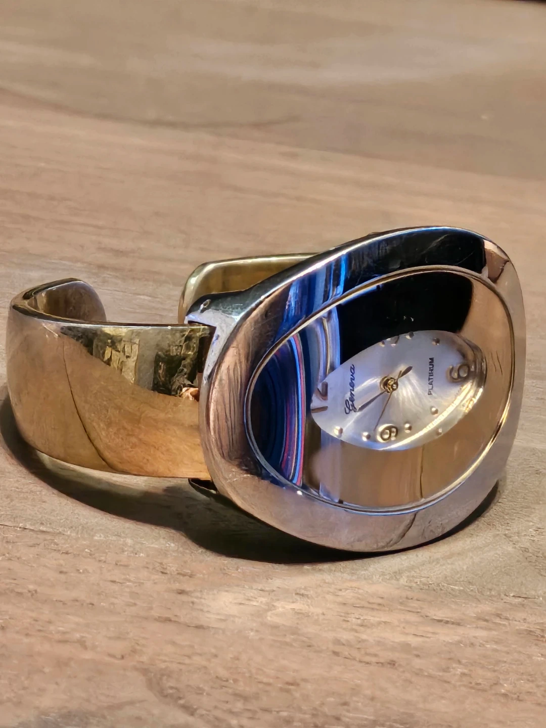 Selling a Geneva Platinum bangle watch. It's a stylish piece with a silver and gold tone. Has a Japan movement, the face has a unique oval shape with clear numbering. A nice addition to any jewellery collection!