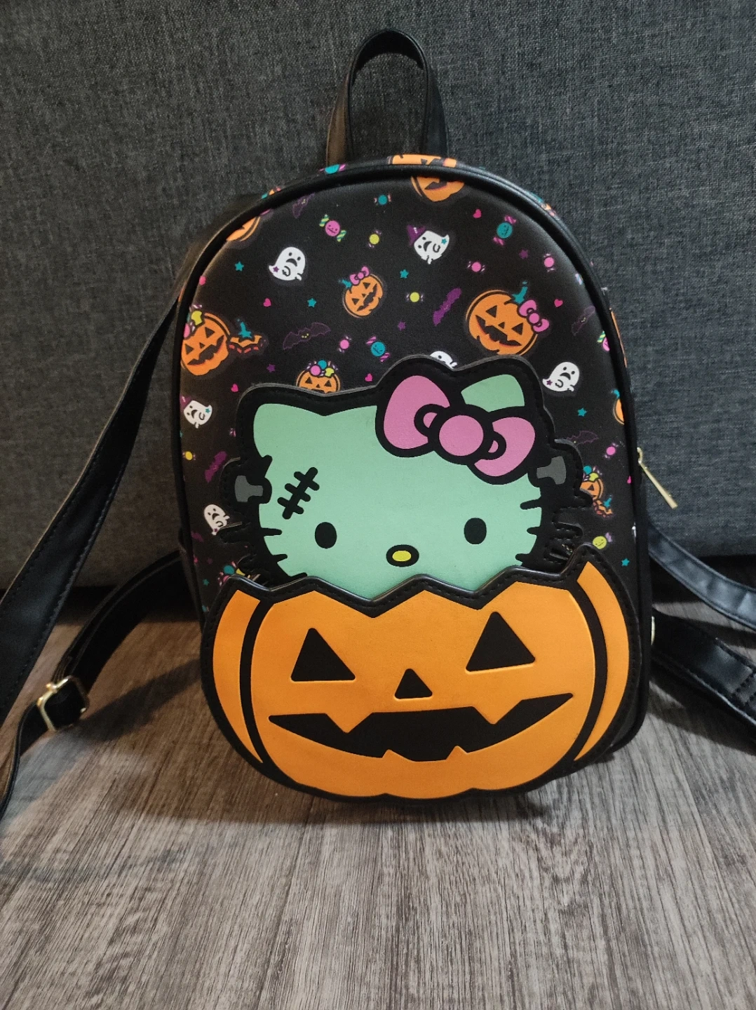 Super cute Hello Kitty mini backpack for Halloween! It features Hello Kitty in a pumpkin design with a black background and Halloween-themed patterns.