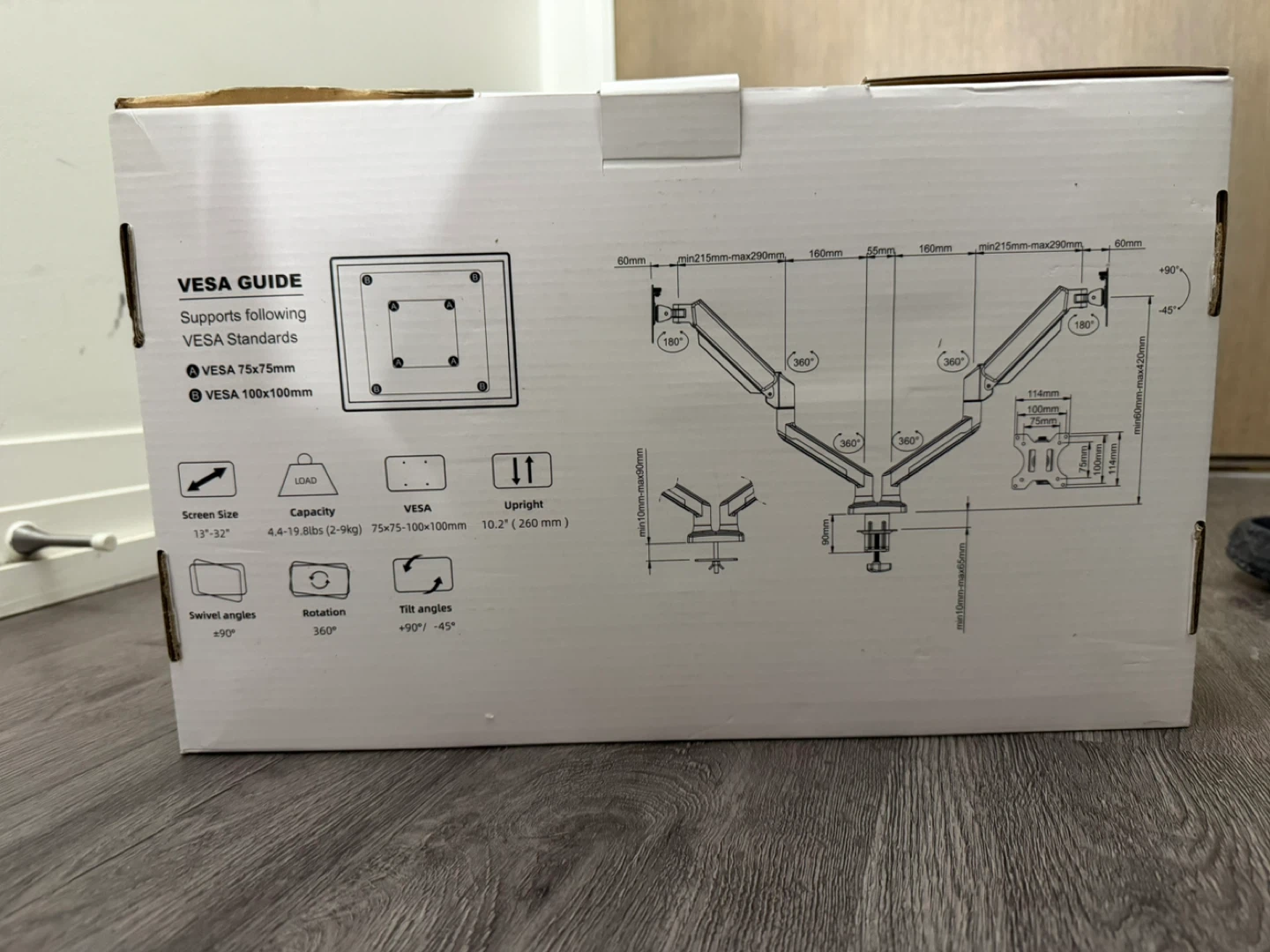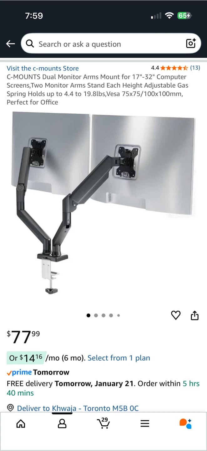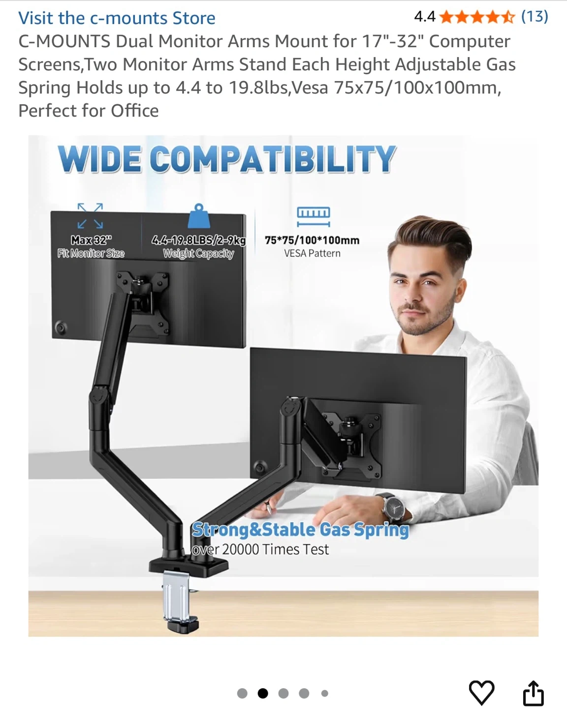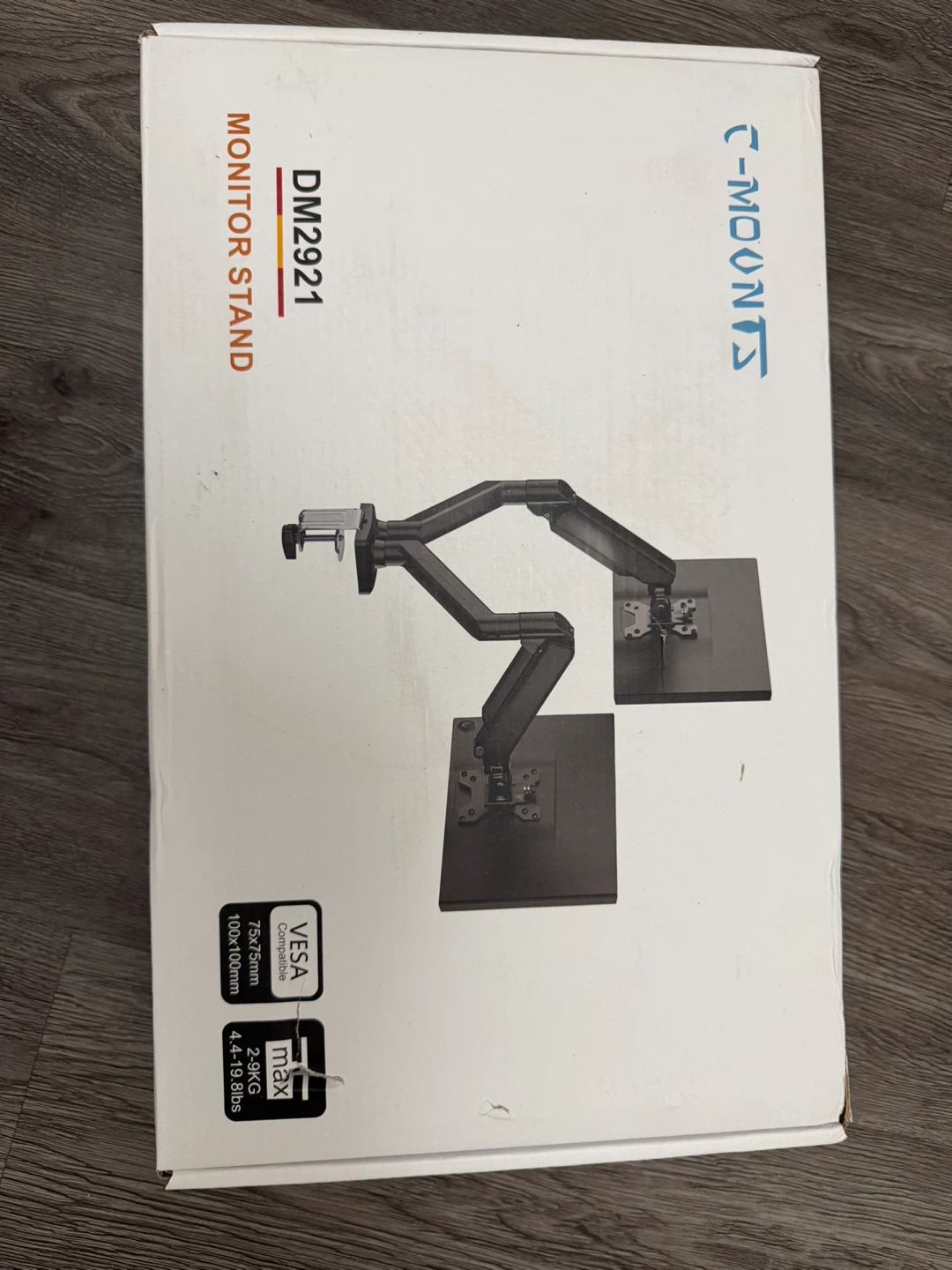 Selling a C-MOUNTS dual monitor arms mount, model DM2921. It's designed for 17"-32" computer screens and can hold up to 4.4 to 19.8lbs. Compatible with Vesa 75x75/100x100mm. Comes with the original box! I bought this for $77.99
