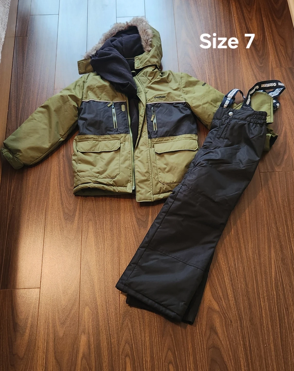 Selling a new OshKosh winter set for kids! It includes a jacket , hat and snow pants, both size 7. The jacket is a stylish mix of olive green and black, while the pants are classic black. Perfect for keeping your little one warm and dry this winter season!