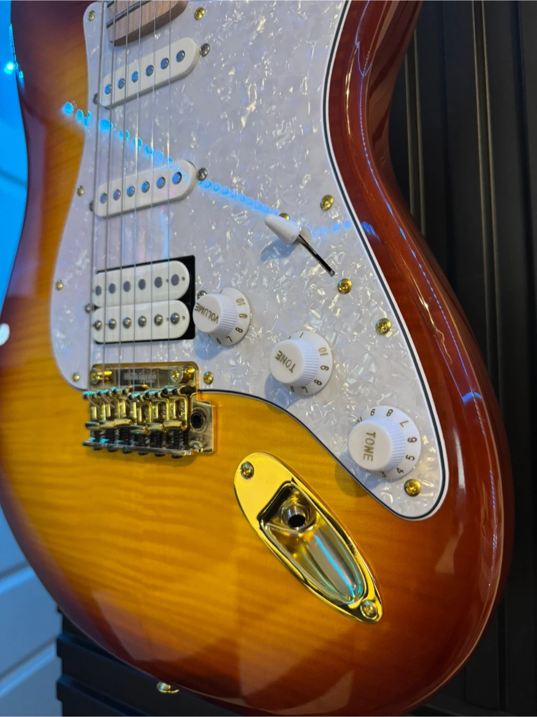 Selling a Fender Corona California Stratocaster. It's in great condition and ready to play! The guitar features a beautiful sunburst finish with gold hardware and a Wilkinson bridge. Perfect for any guitar enthusiast! 450