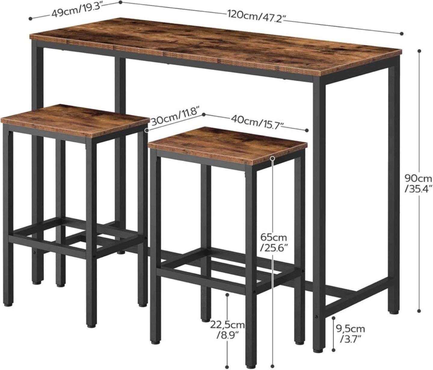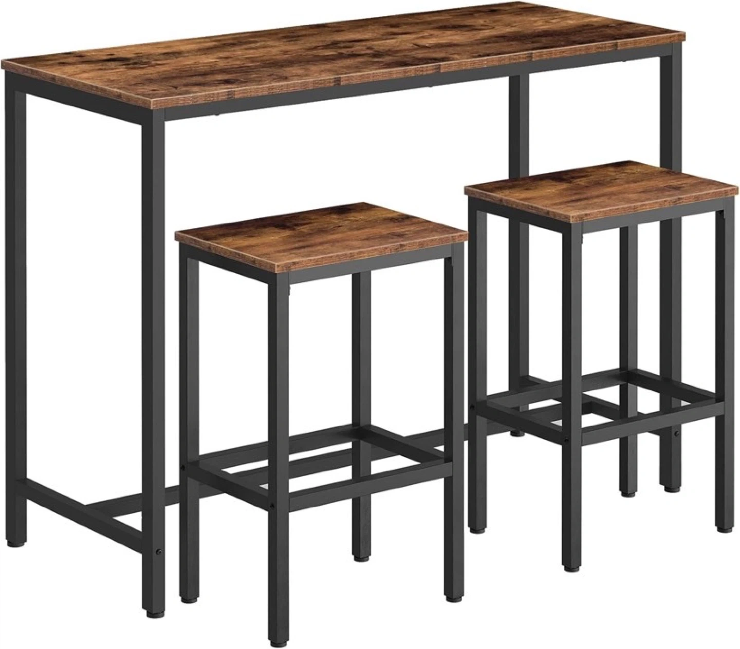 This bar table set comes with a table and two matching stools, perfect for a small dining area or kitchen nook. The rustic brown finish and black metal frame give it a modern industrial look.