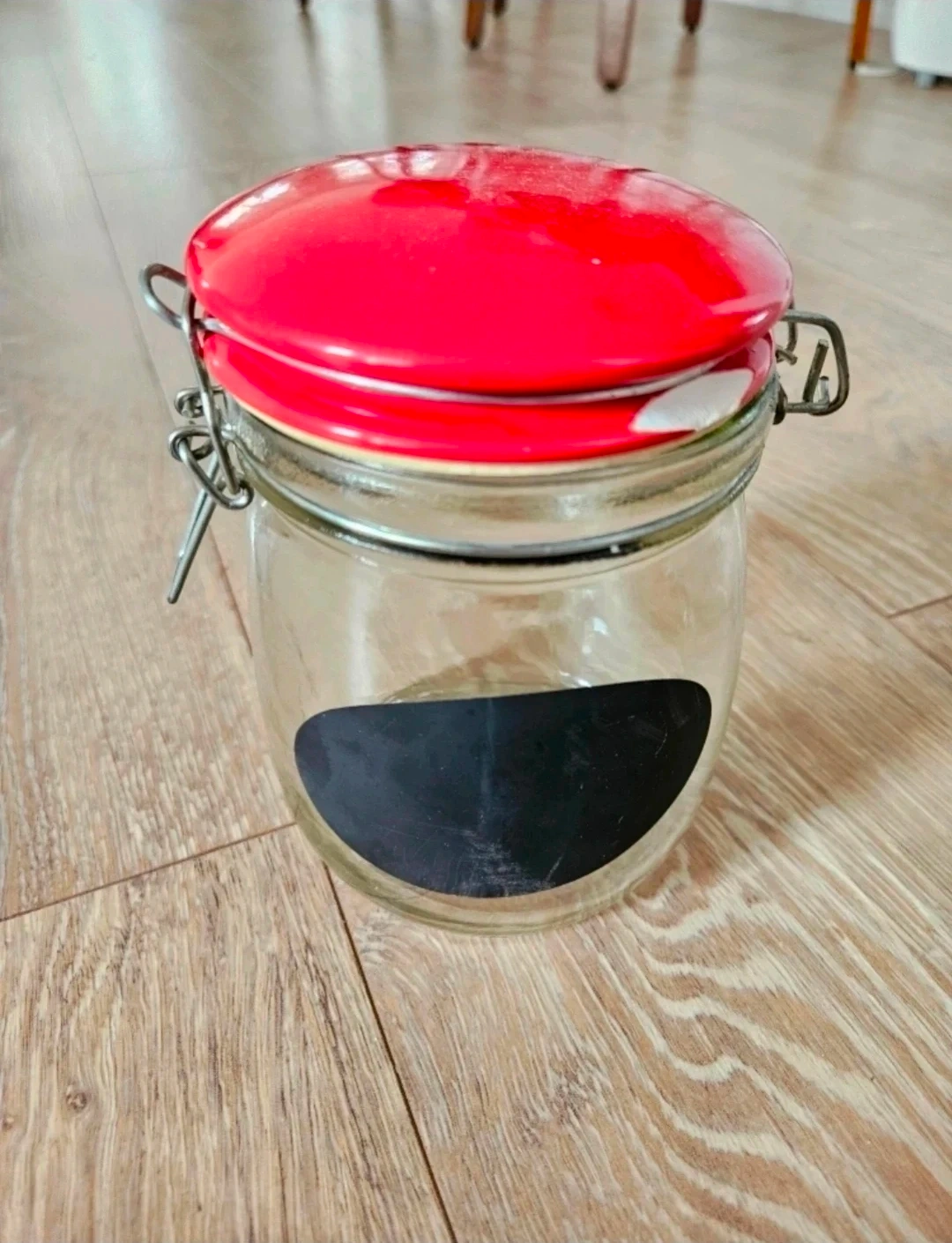 Selling a glass jar with a red lid. It has a chalkboard label on the front, perfect for organizing your pantry or storing crafts. It's in great condition and ready for a new home!