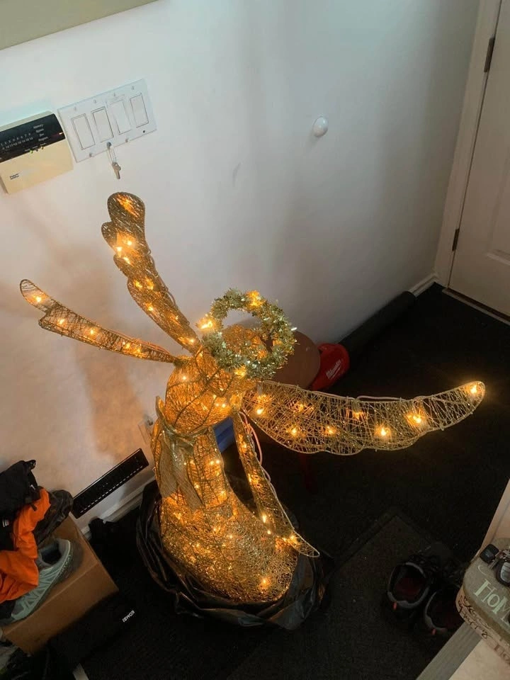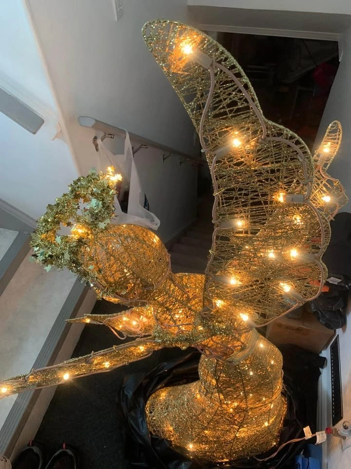 Gold angel decoration with lights. Has a ribbon around the waist and wings. Lights up with warm glow. Made of sparkly gold material. Good condition, some signs of use. About 4.5 feet in height, about 2 feet at widest point.