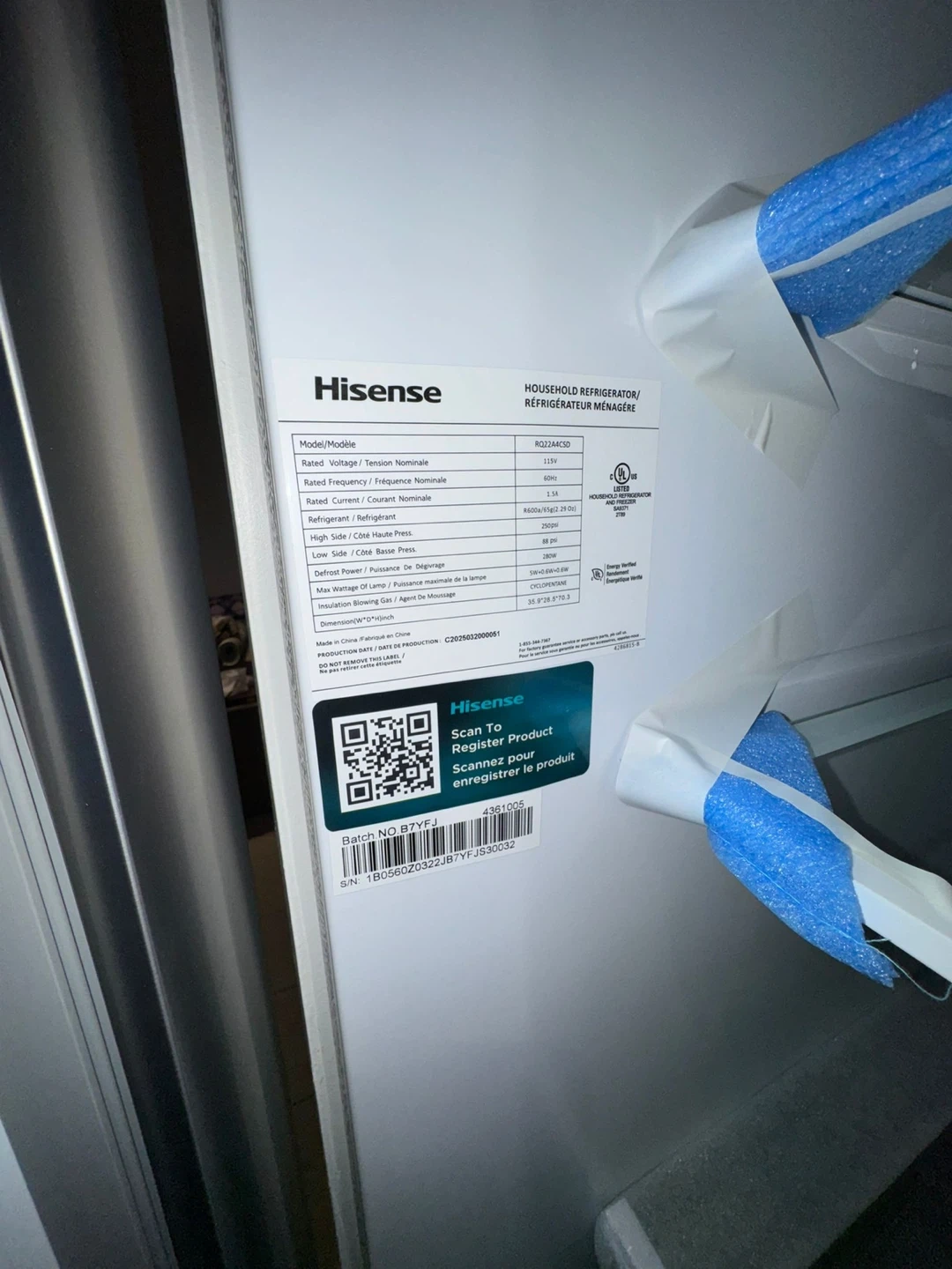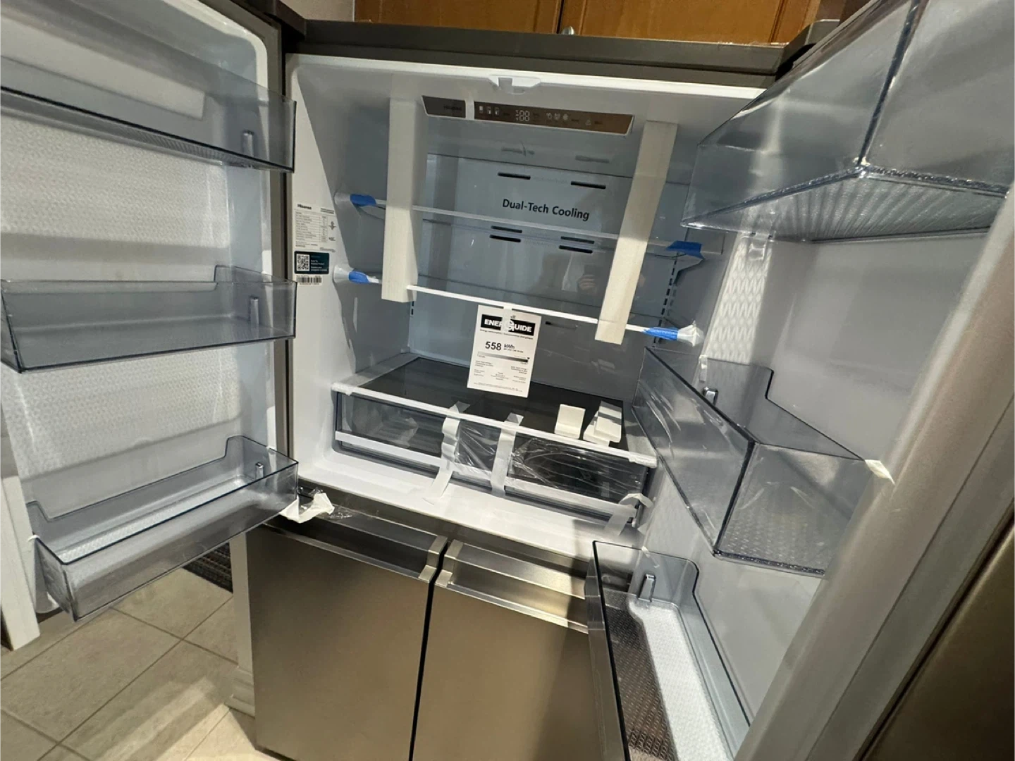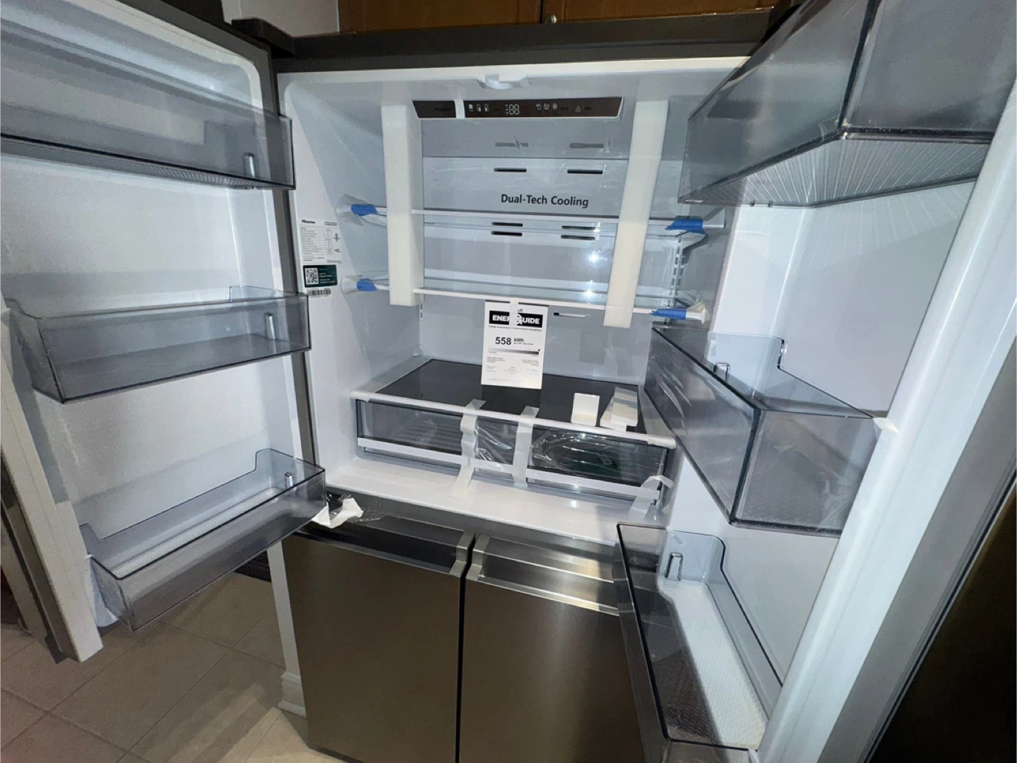 Selling a Hisense French door refrigerator in stainless steel. It features Dual-Tech Cooling and Inverter Technology. It also comes with a 2-year warranty on parts, as well as a 5-year sealed system and compressor warranty. Never used. Brand new refrigerator, opened only for inspection. Never used and still