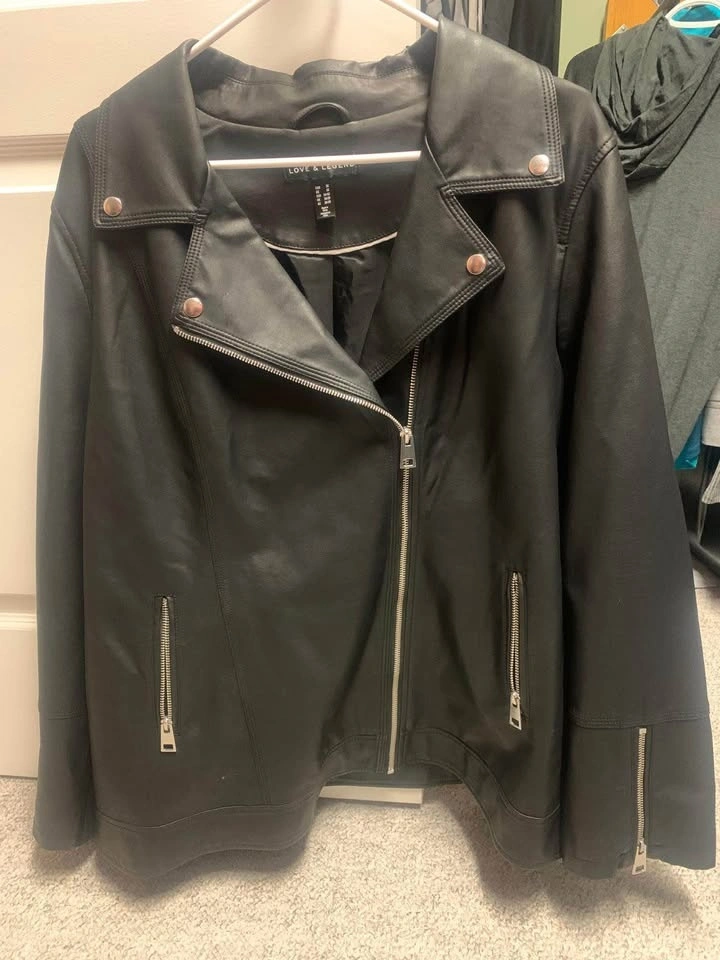 2 Ladies Pleather jackets, Size US 20 & 22. $70 for both. Pick up only in Dovercourt Community (Northwest Edmonton). From a smoke and pet free home. Black leather jacket with multiple zippers, has a collar and long sleeves. In good condition.
