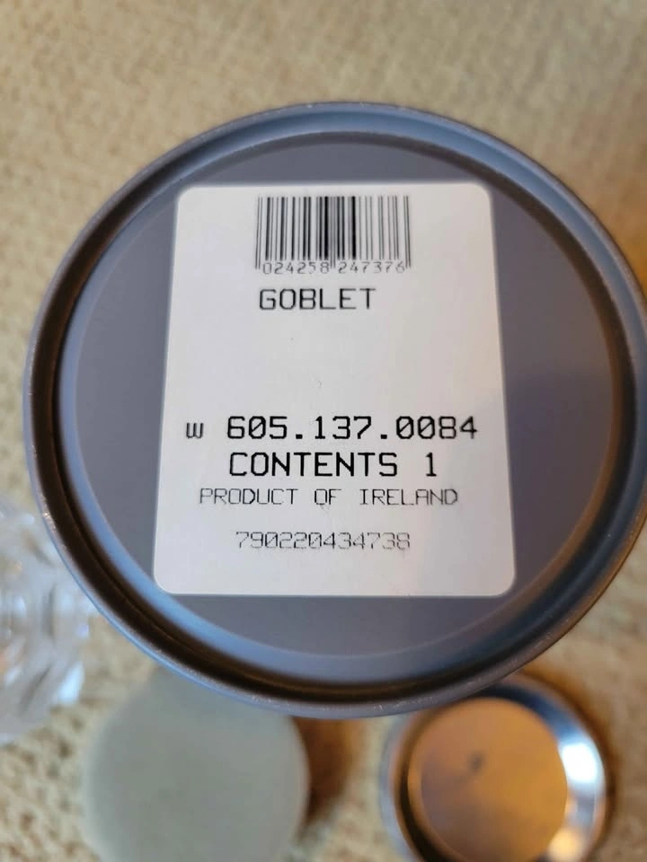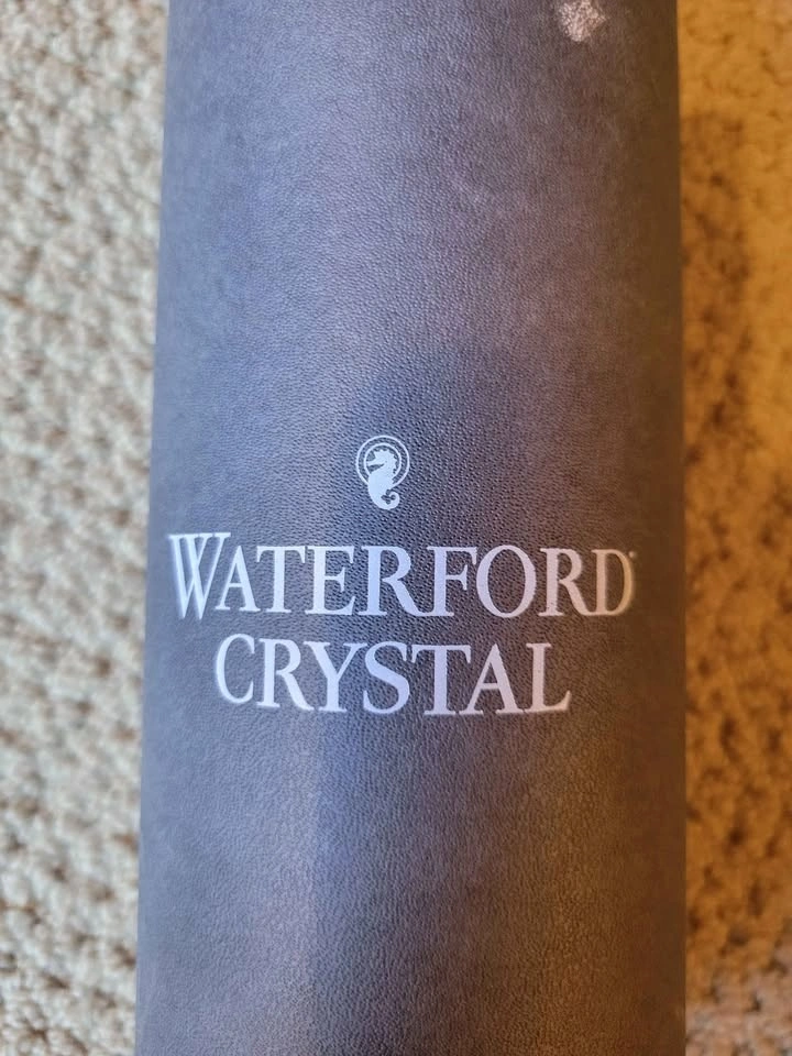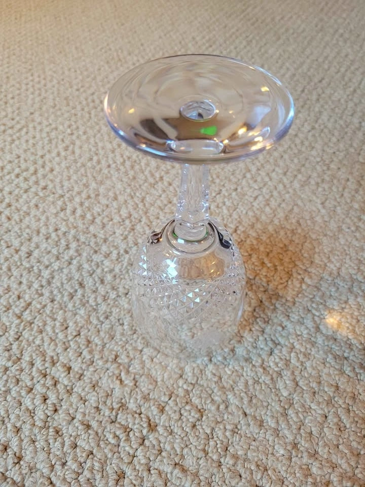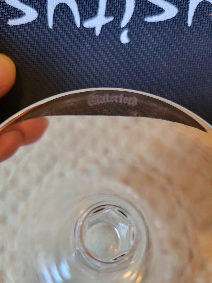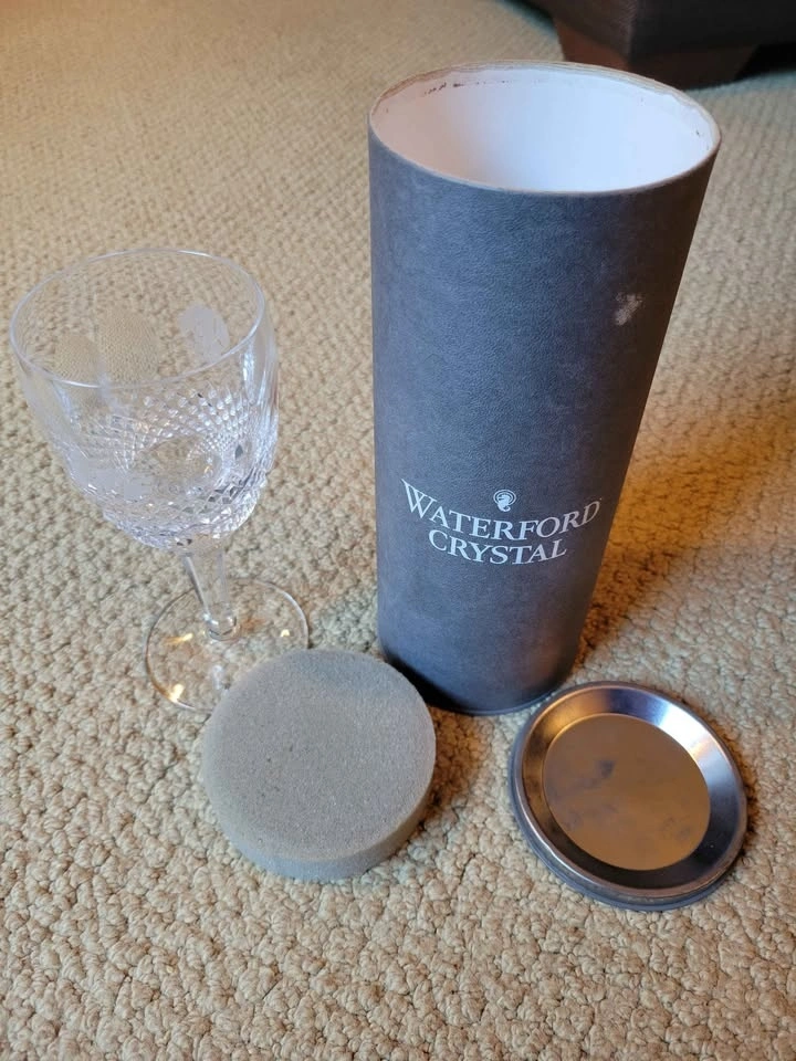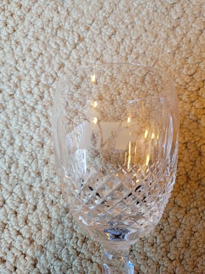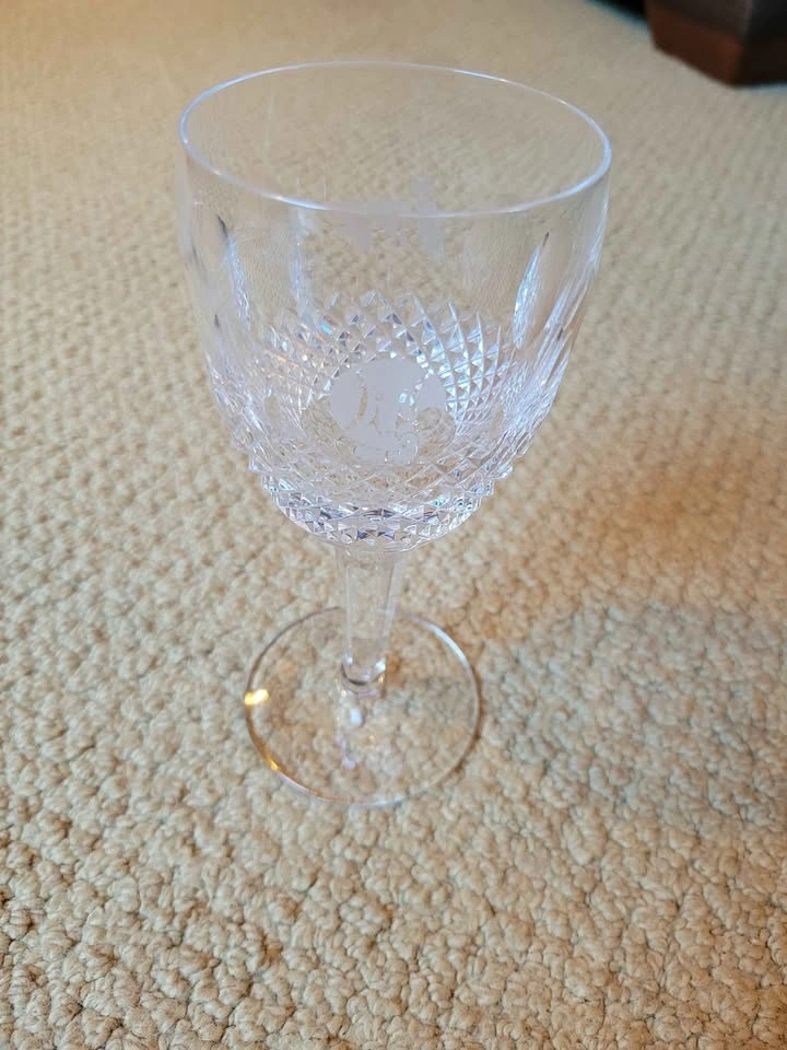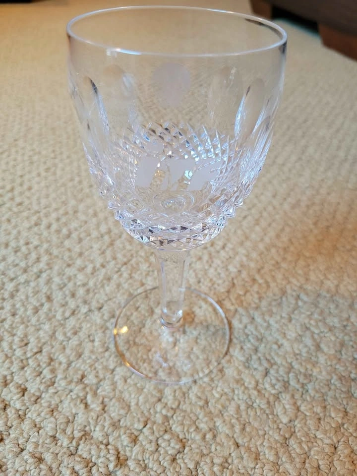 Waterford Crystal Colleen pattern claret or white wine glass. The Colleen pattern, introduced in 1953, is known for its signature rounded, oval cuts that capture light beautifully. This appears to be a short-stem claret wine glass, measuring approximately 4 3/4 inches tall. It is made of lead crystal, which makes it significantly heavier than standard glass and produces a clear, bell-like sound when gently tapped. Genuine Waterford pieces made since the 1950s usually have an acid-etched mark that says "Waterford" or features the seahorse logo, often found on the base of the stem. It has an ITF logo (International Tennis Federation) and may have been a prize for a tournament at some point.