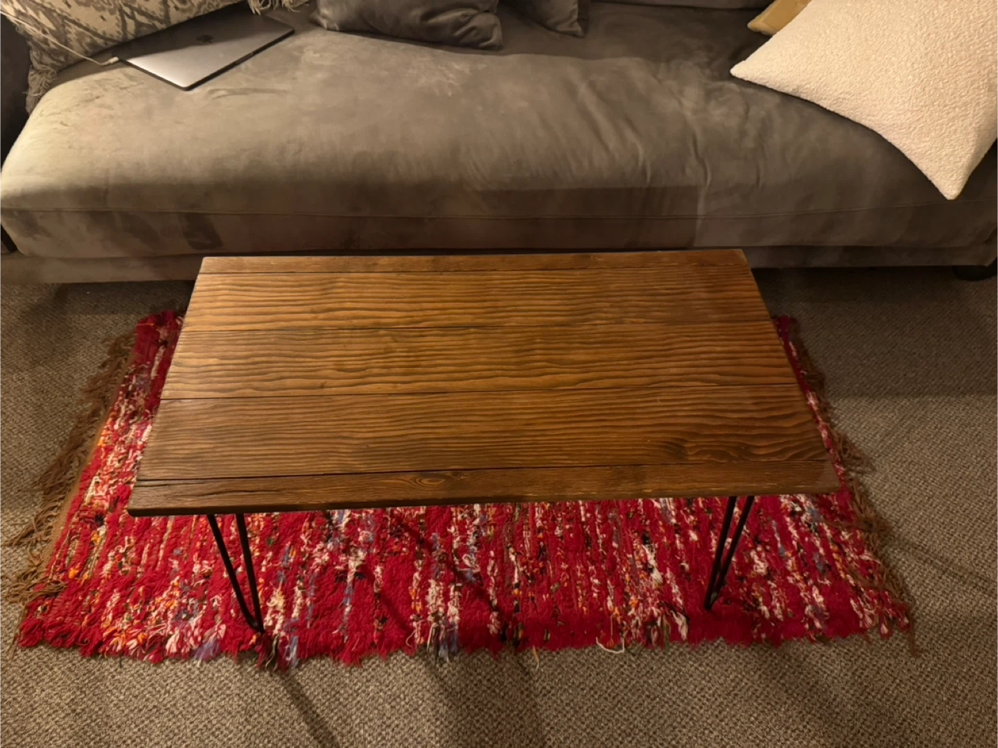 Selling a wooden (Douglas fir) coffee table with black hairpin legs. It's in great shape and would look great in any living room or den