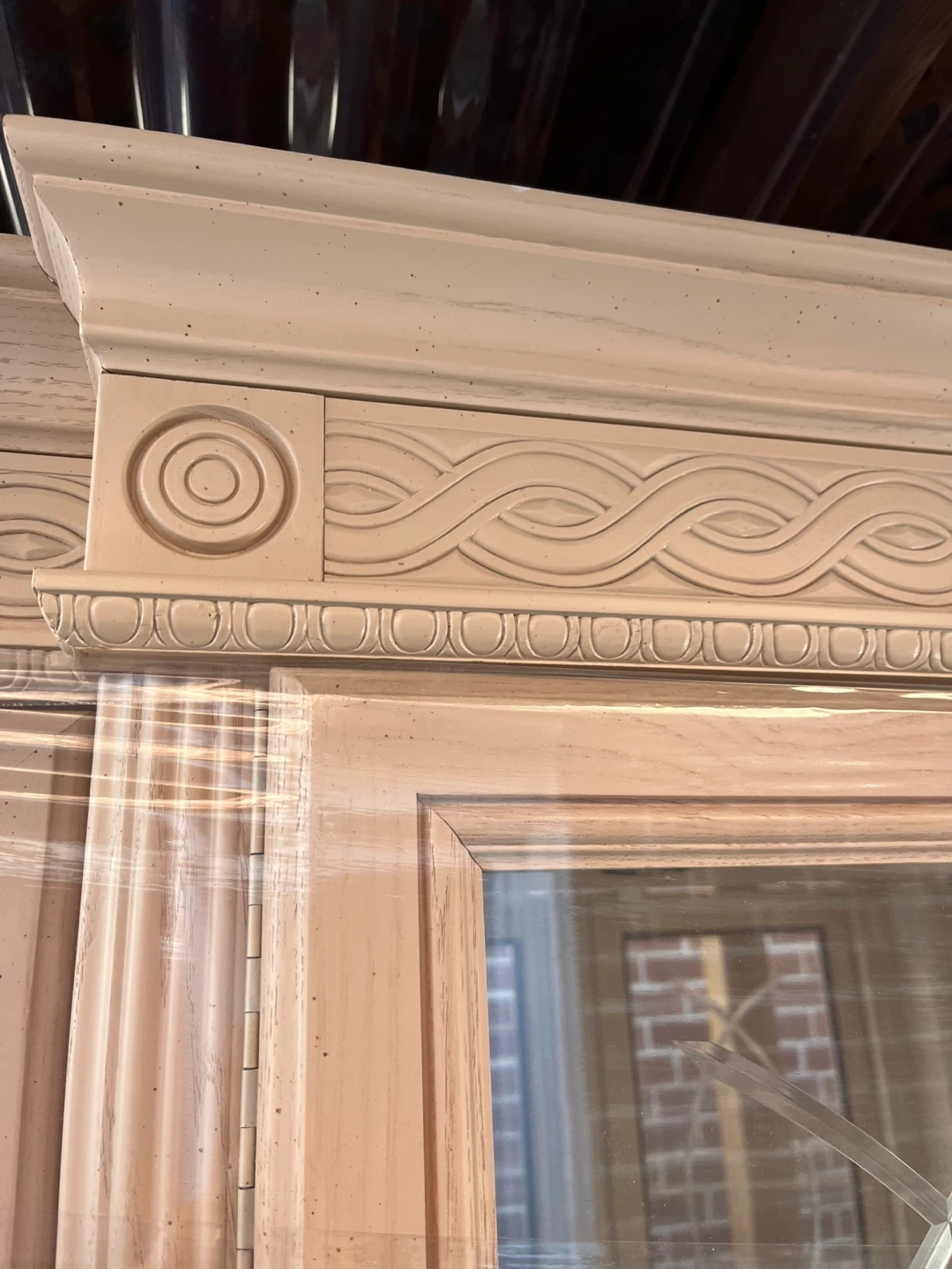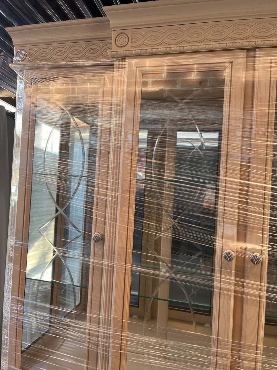 Moving sale! A beautiful wooden Buffet and Hutch. It has glass doors on the top half and wooden cabinet doors on the bottom half. There are decorative details on the top. Excellent condition.