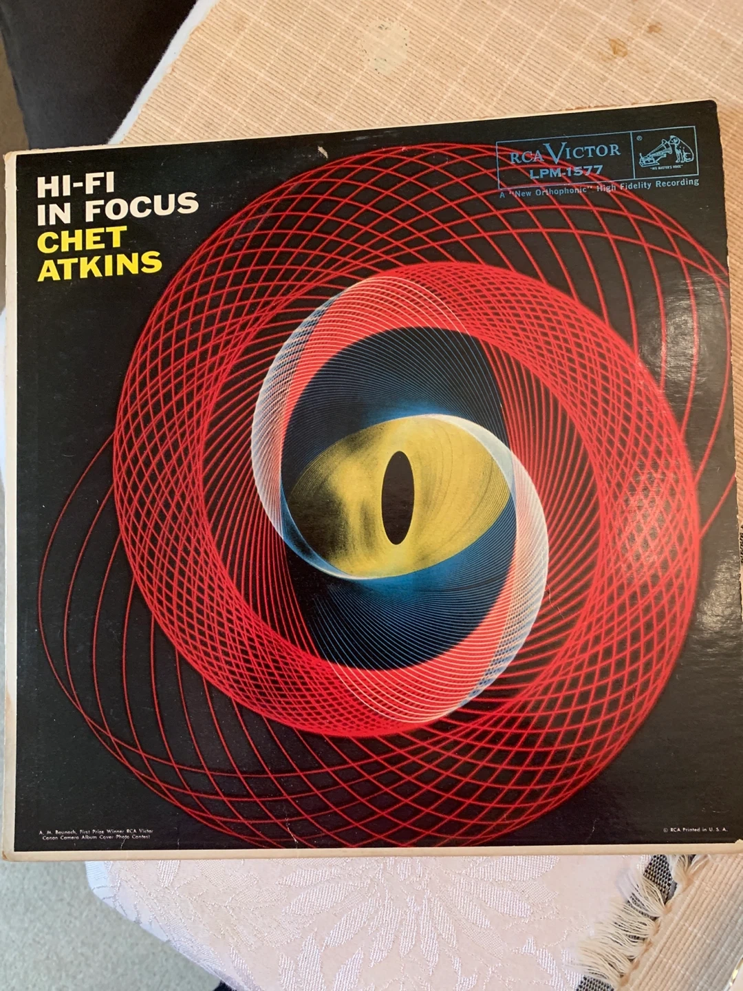 Selling a Chet Atkins vinyl record, titled "Hi-Fi in Focus" on the RCA Victor label. It's LPM-1577, a "New Orthophonic" High Fidelity Recording. A cool vintage find!