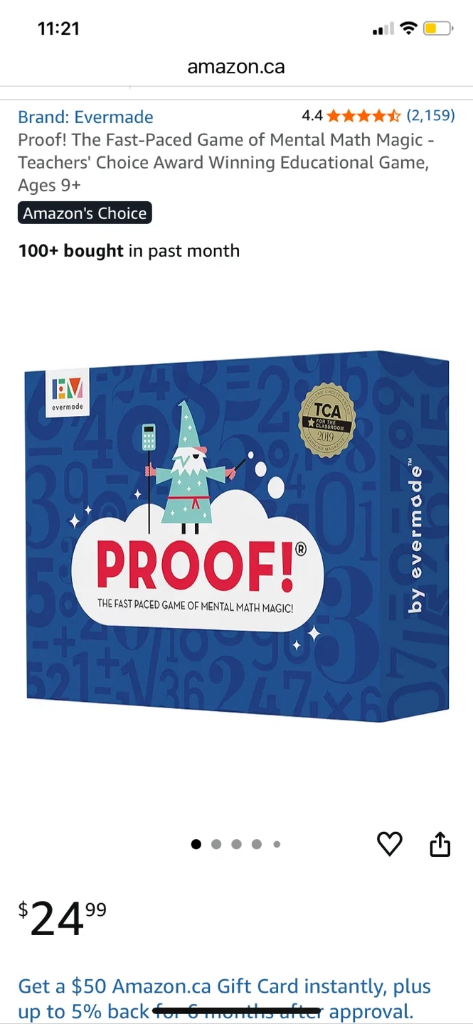 Selling the Evermade Proof! game, a Teachers' Choice Award-winning educational game for ages 9+. It's a fast-paced game of mental math magic! Originally bought for $24.99