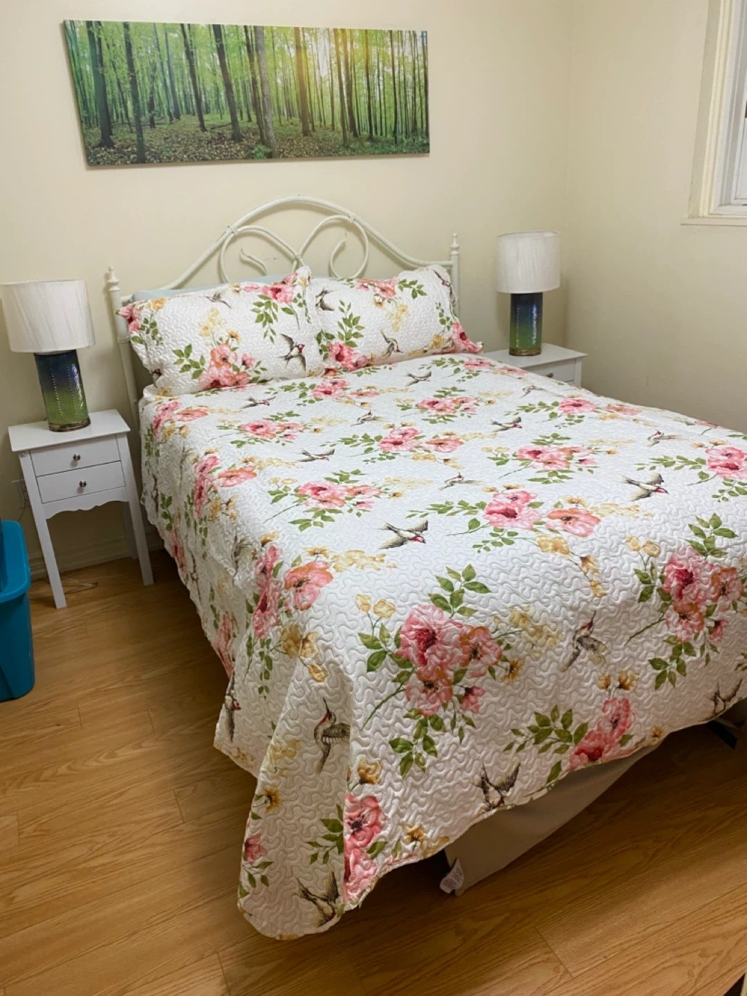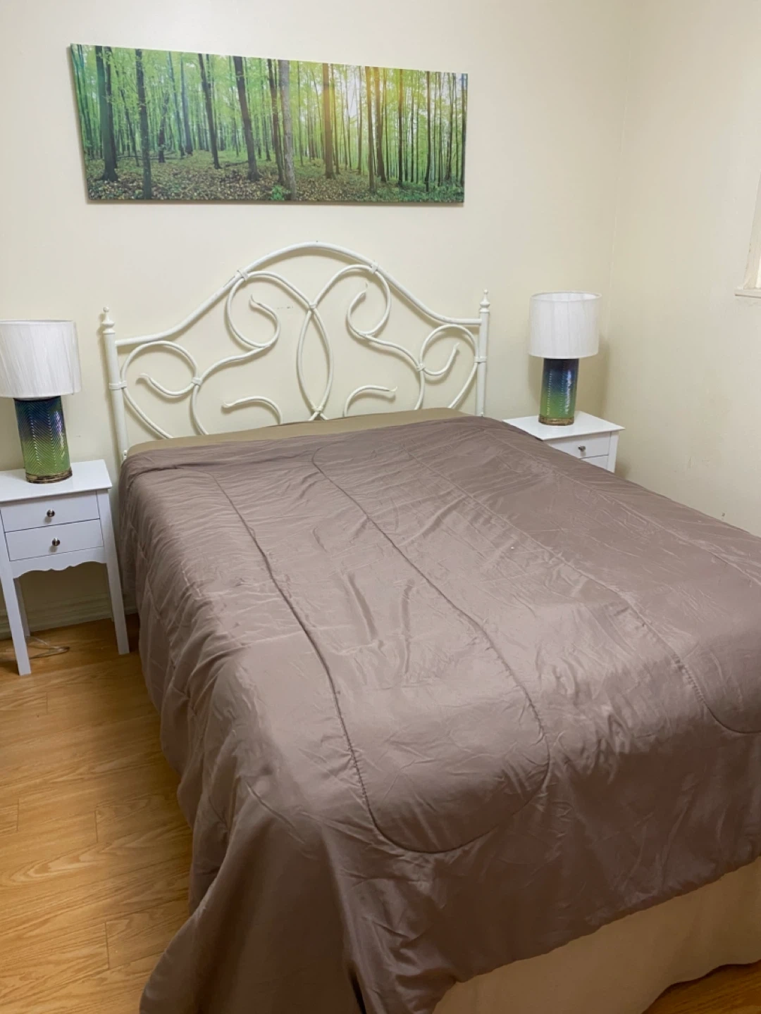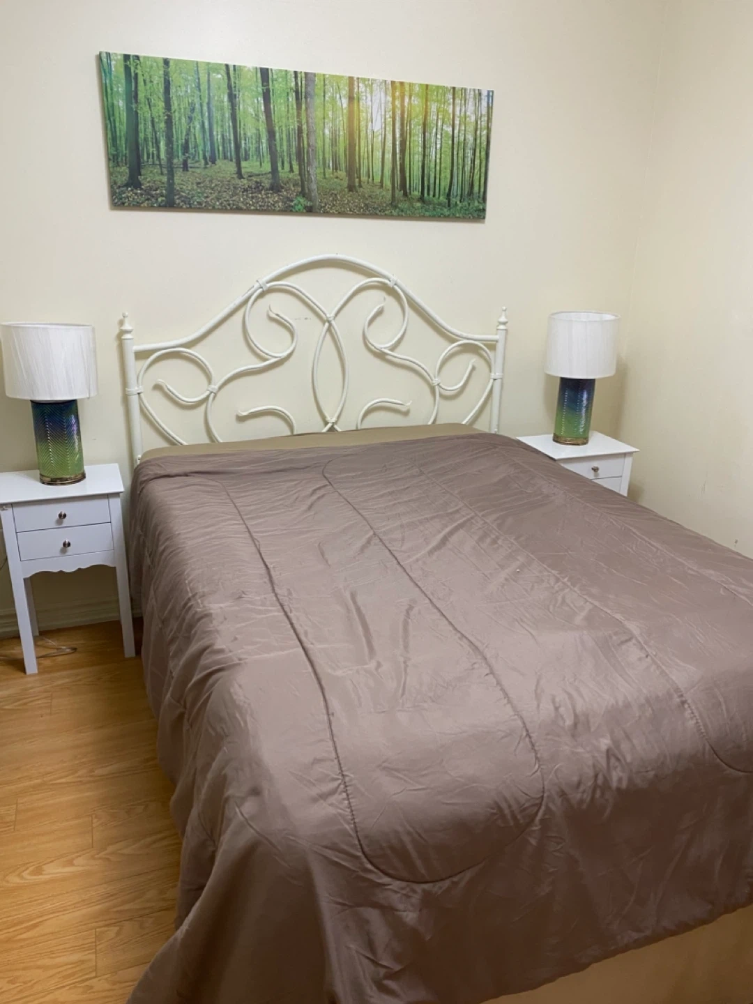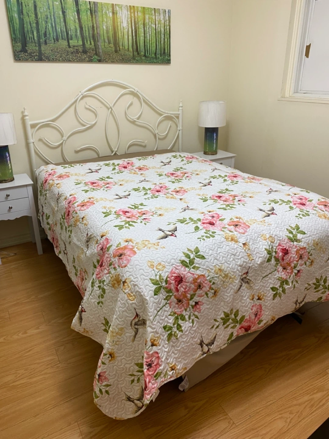 Queen size mattress, BoxSpring, full frame,headboard, quilted bedcover and pillows. All included. Was used for home staging - like new Non pet and Non smoke free home. Immaculate condition. Great for everyday use or for your guest bedroom.