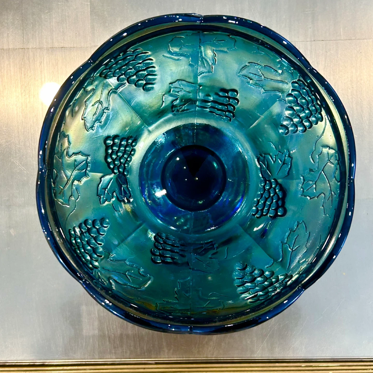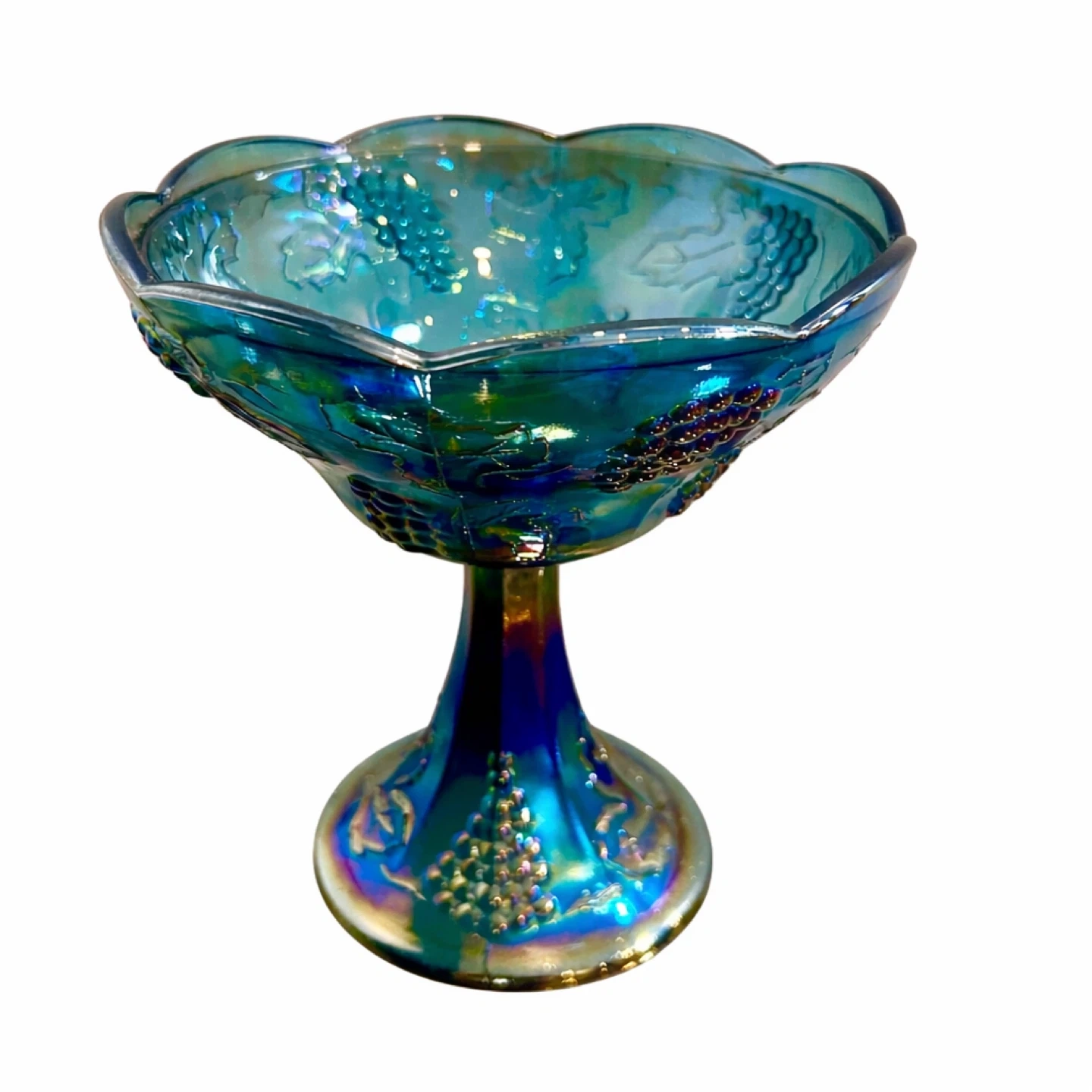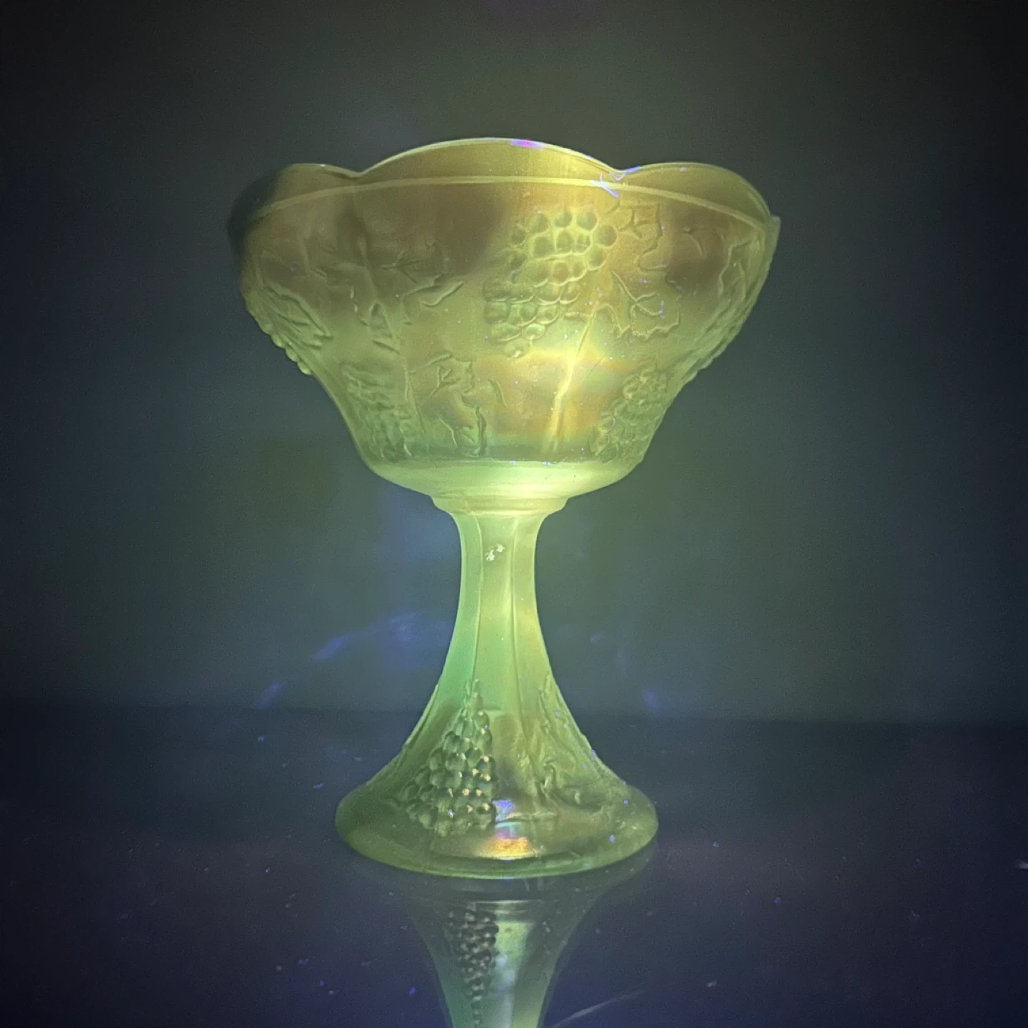 Uranium glass, blacklight reactive, carnival glass, iridescent, grapevine, compote, pedestal bowl, pressed glass, early 20th century, antique glass, collector.