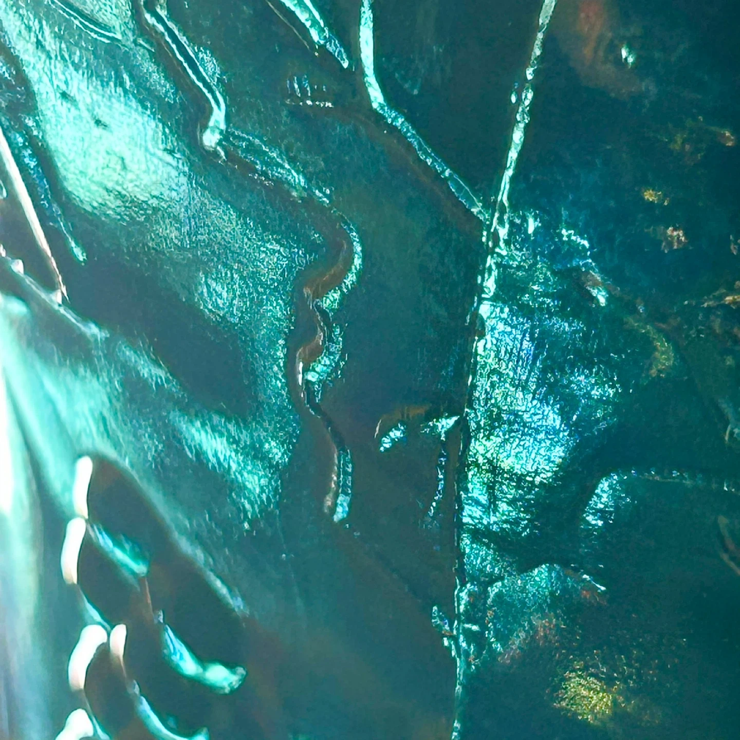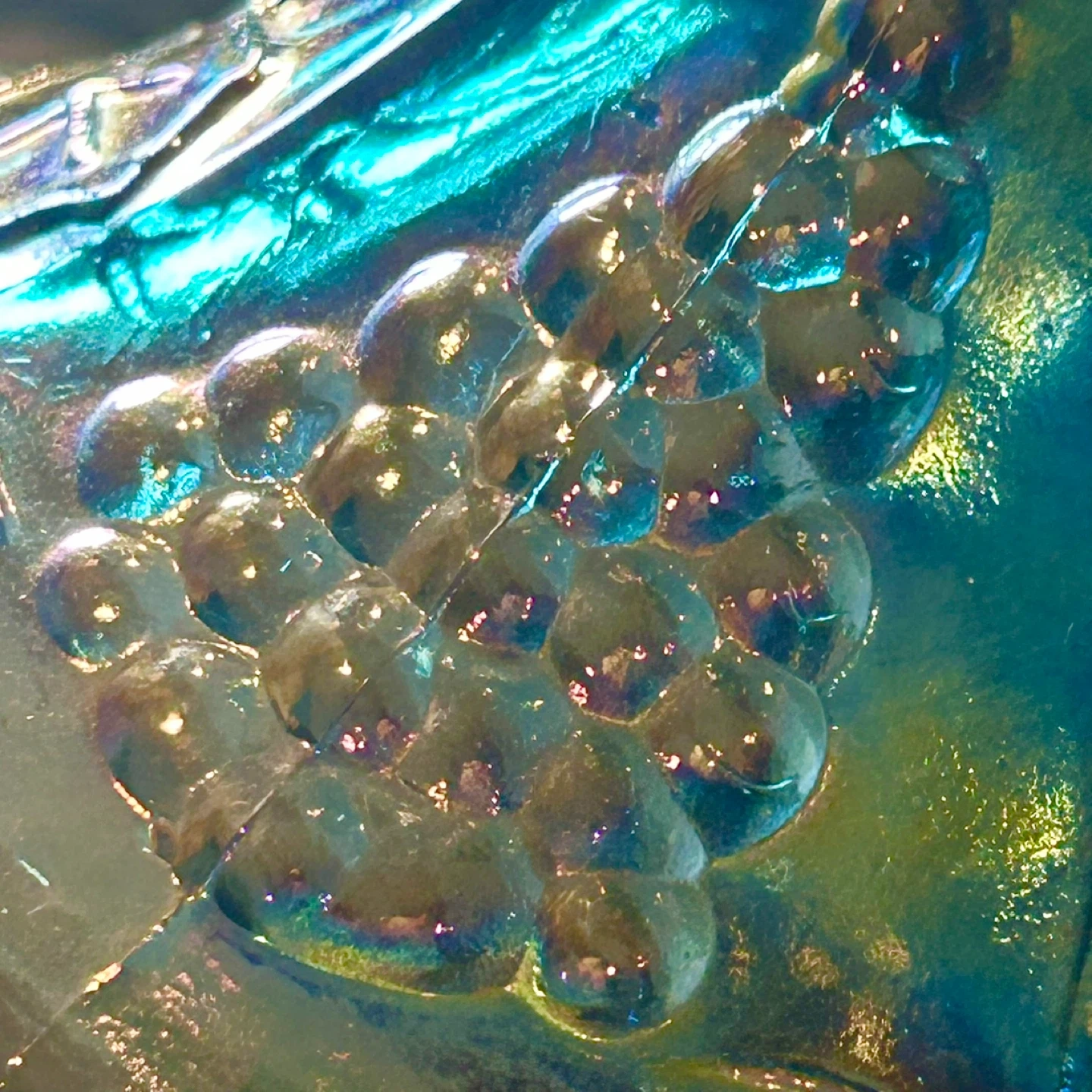 This piece shows both: true struck iridescence and blacklight-reactive uranium glass.