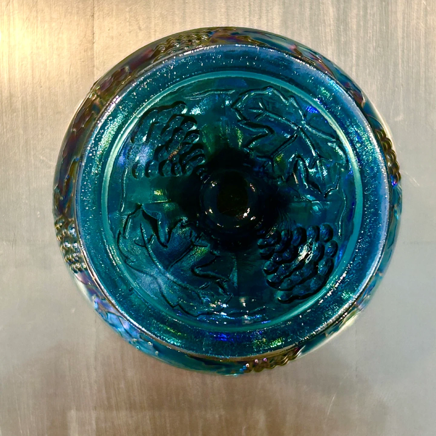 Likely North American production based on carnival-era pressed-glass tradition and grapevine patterning. (Presented as an informed estimate; exact factory attribution requires confirmed pattern match.)