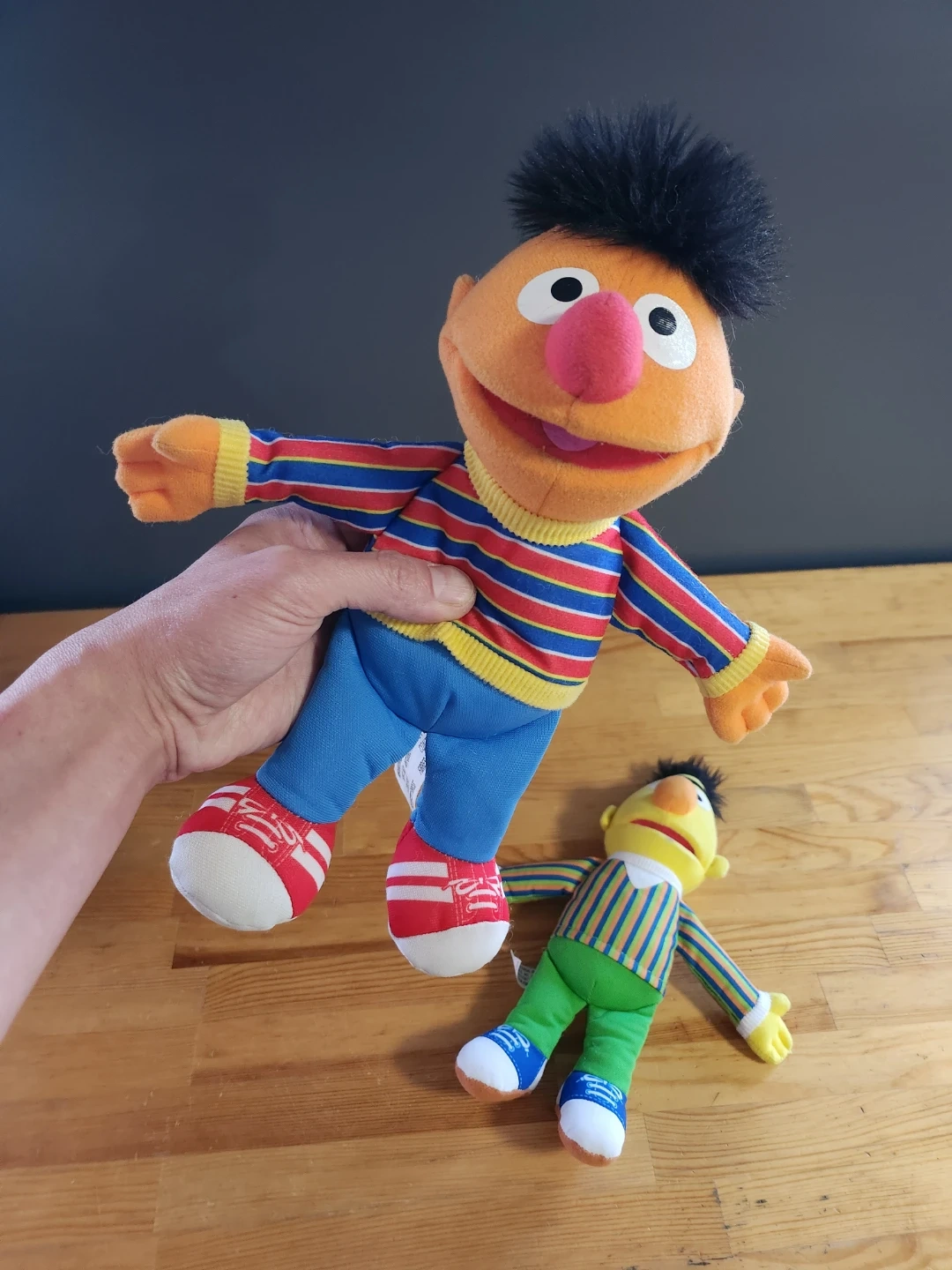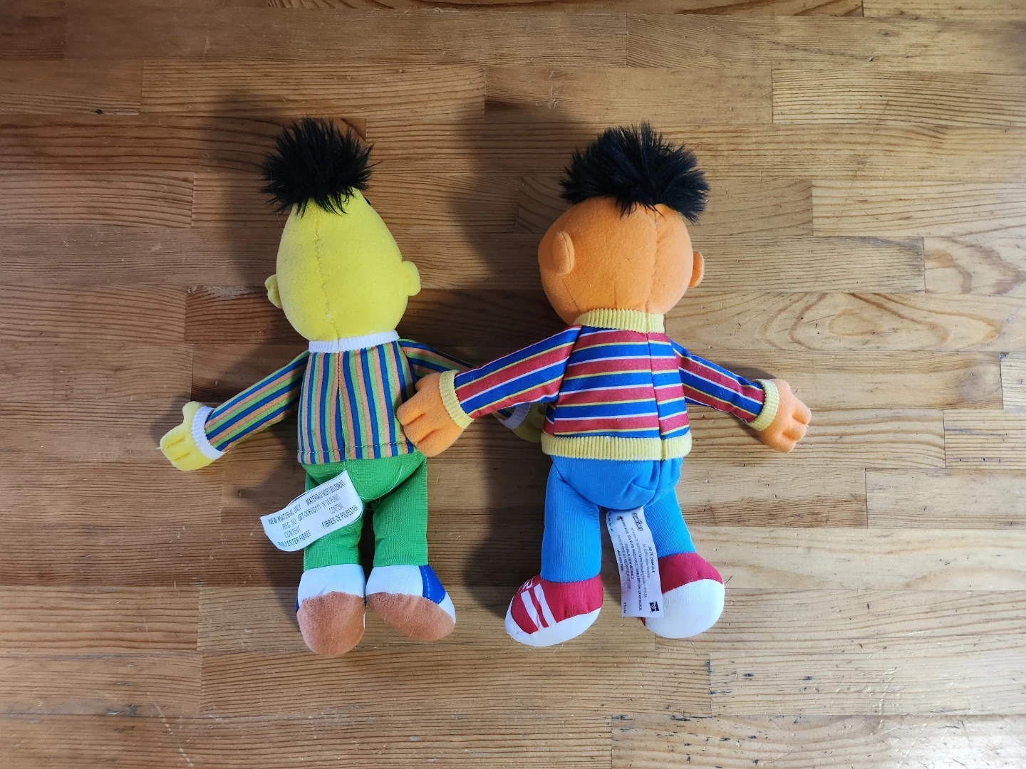 Set of Bert and Ernie plush dolls from the television show Sesame Street.