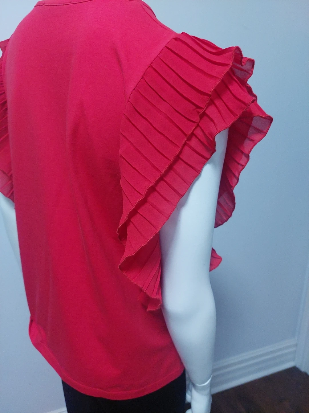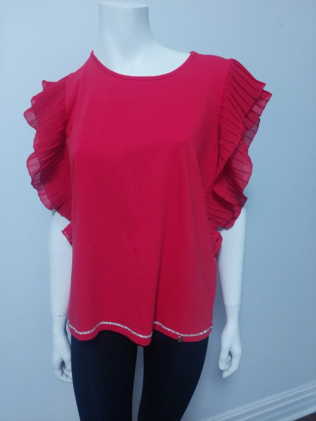 Valentine! Beautiful red top with unique ruffle sleeves. It also has a decorative trim along the bottom. Perfect for adding a pop of colour to your wardrobe!