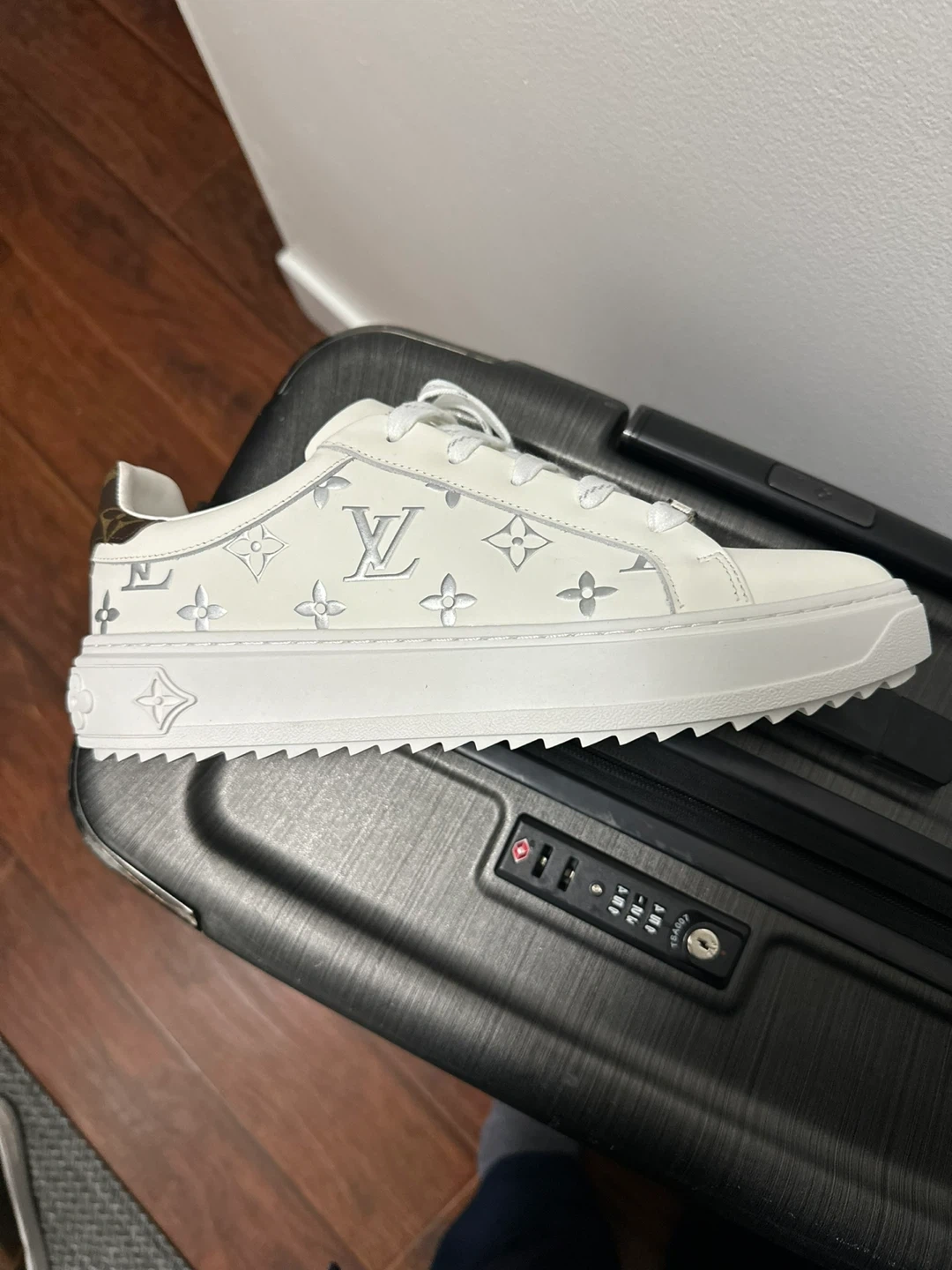 Selling a pair of Louis Vuitton sneakers in white leather. They feature the classic LV monogram pattern in silver throughout. The heel has a brown monogram accent. Great condition!