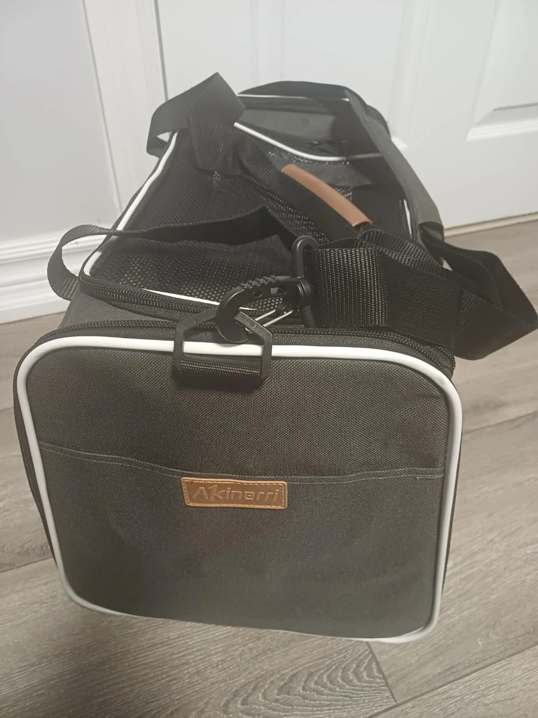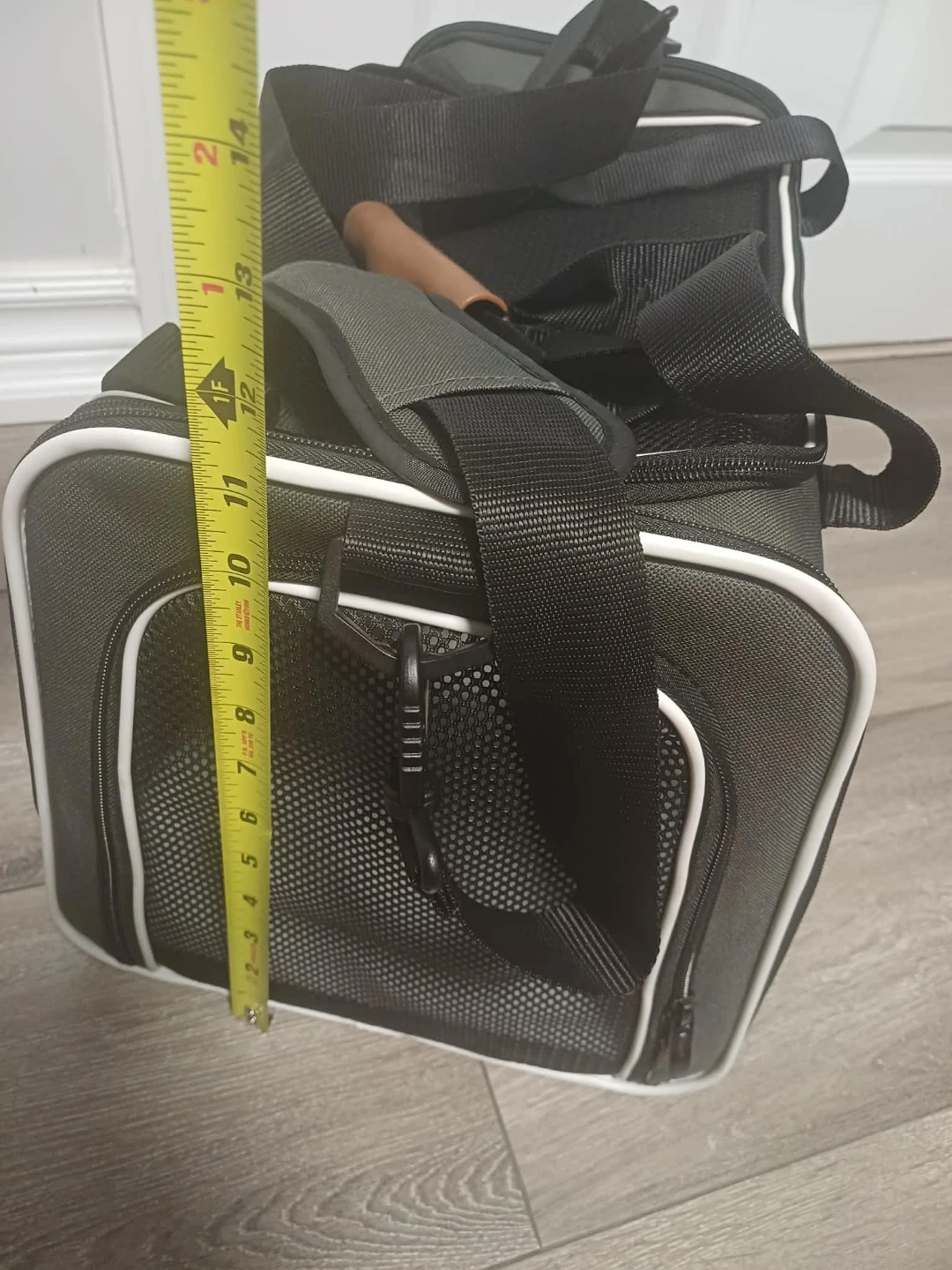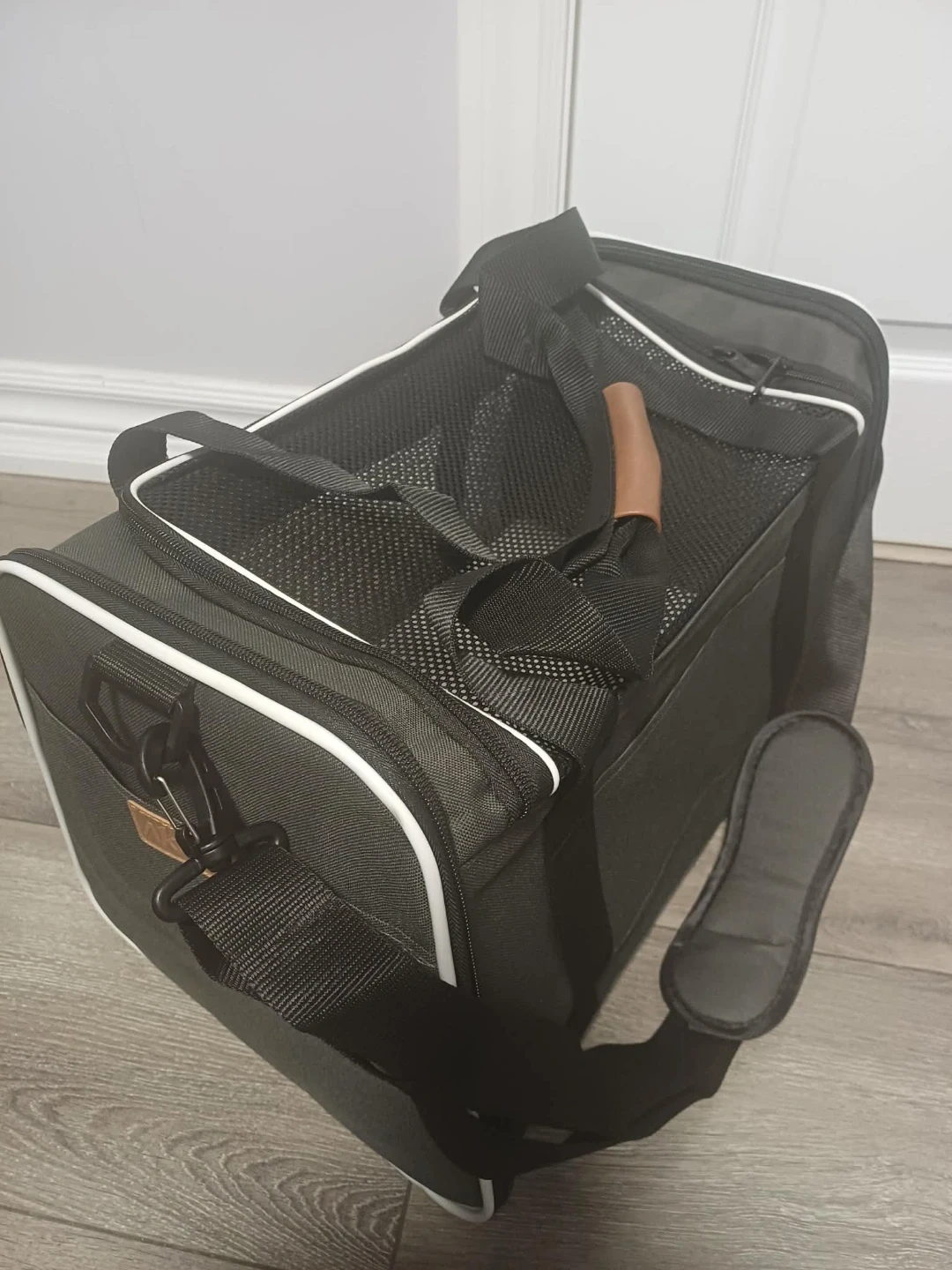 Selling an Akinerri airline approved pet carrier in grey. It's a soft-sided, collapsible pet travel carrier. Measurements are approximately 17 inches long and 11 inches high. Features include a safety inner leash, a pocket for treats/toys, self-lock zippers, a sturdy hook, a side strap onto a rolling suitcase handle, and shoulder straps that can hang on. It also comes with a cozy, hand-washable mat