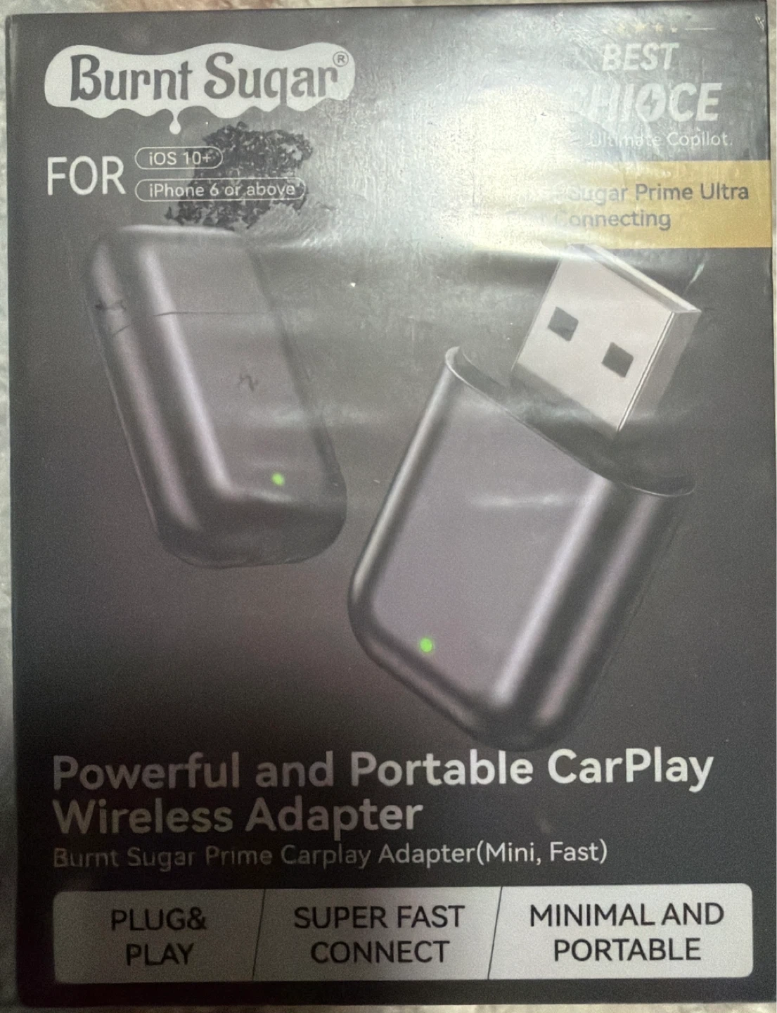 Selling a Burnt Sugar Prime CarPlay Adapter! It's a wireless adapter that's powerful and portable. It's designed for iOS 10+ and iPhone 6 or above. It's super fast to connect and minimal and portable, so it's easy to take with you