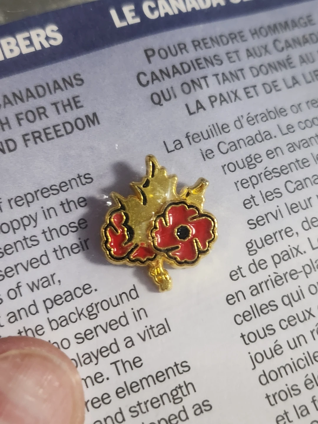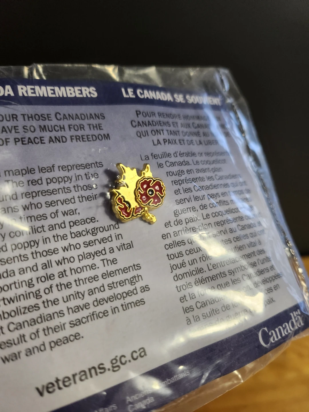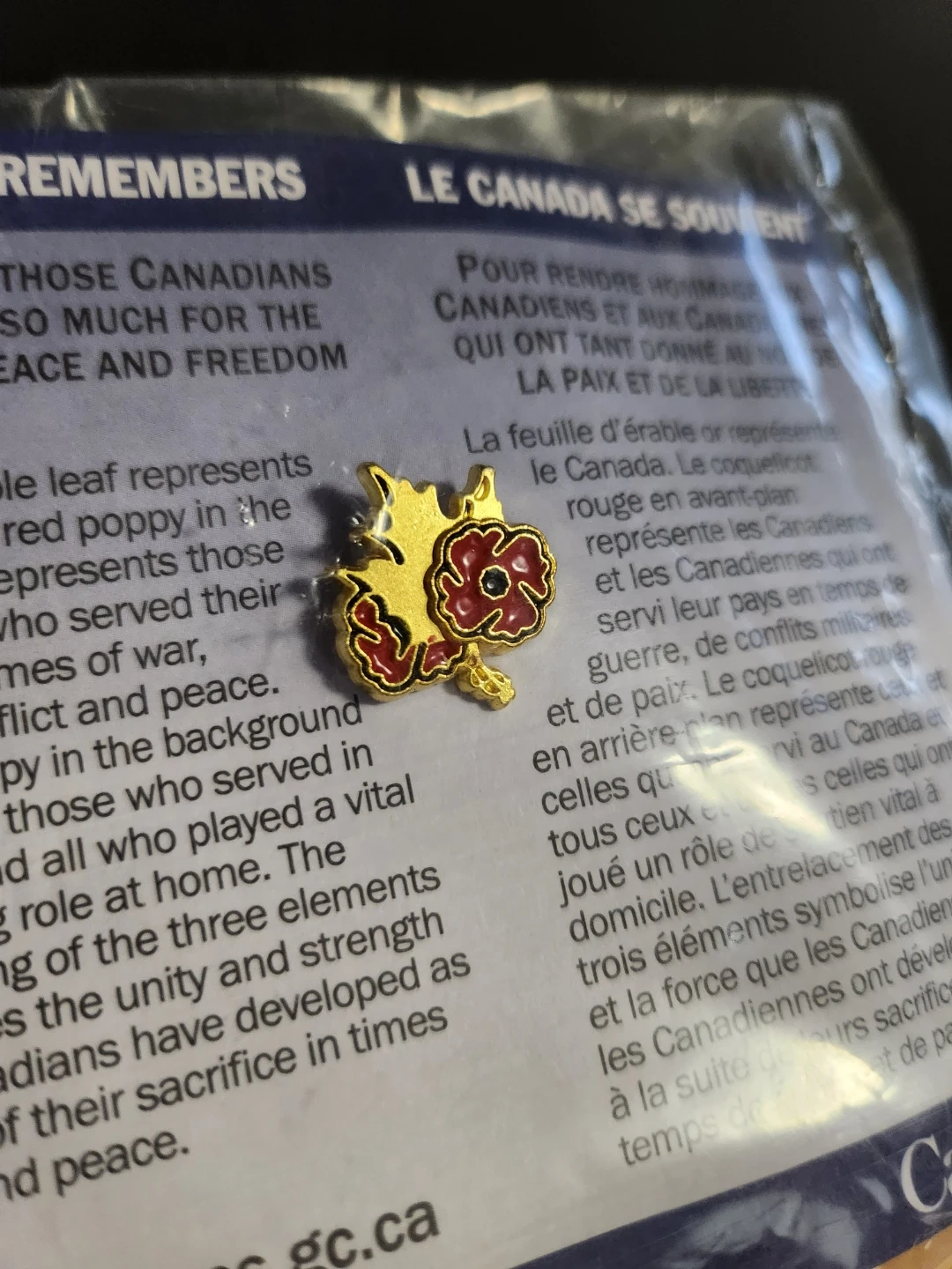 "Canada Remembers" lapel pin distributed by Veterans Affairs Canada. This specific pin features a gold maple leaf and two red poppies, and is an official symbol of remembrance, distinct from the traditional single paper poppy pin.