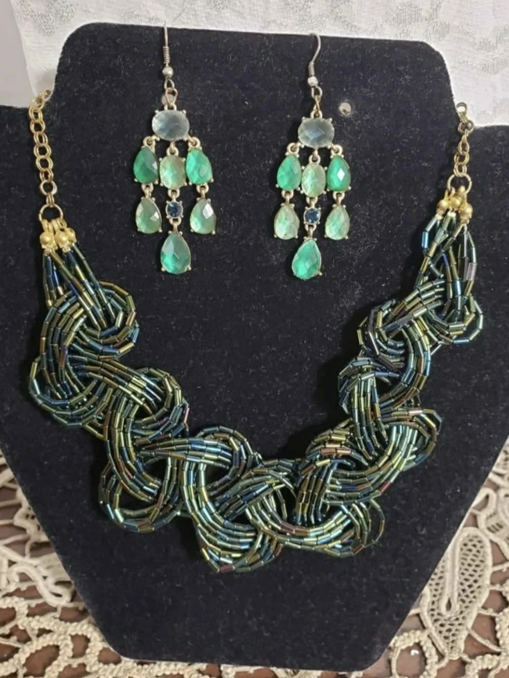 Beautiful necklace and earring set featuring green and blue tones. The necklace has an intricate beaded design, and the earrings are adorned with green teardrop gems. Perfect for adding a touch of elegance to any outfit!