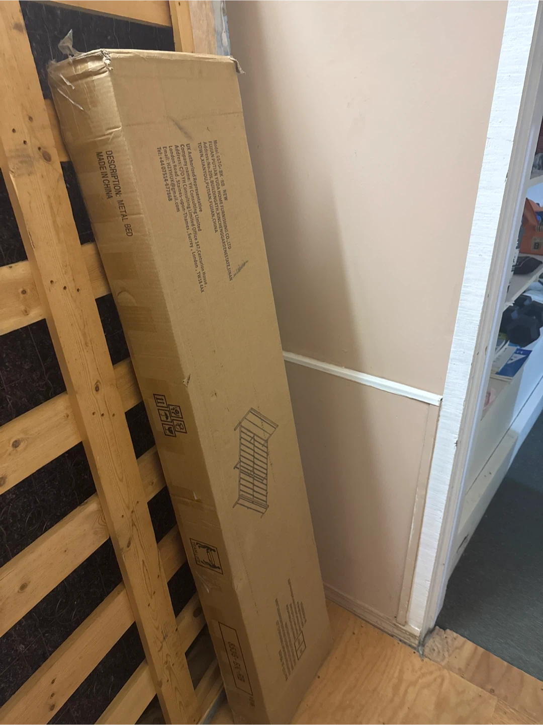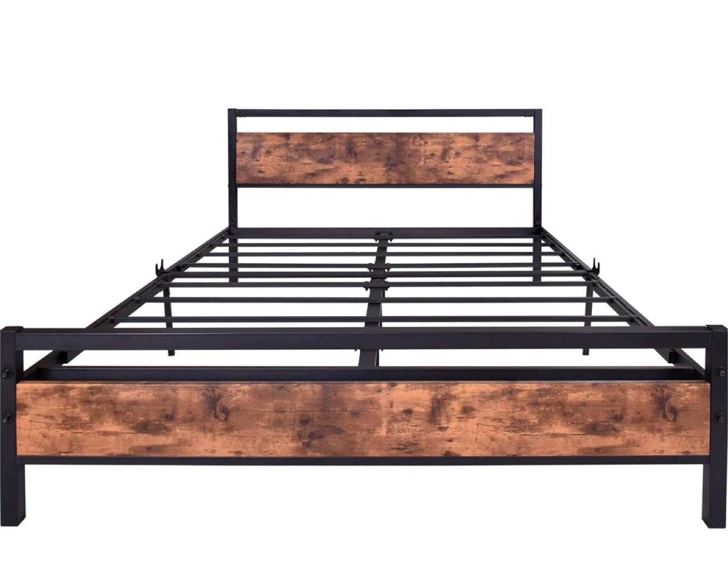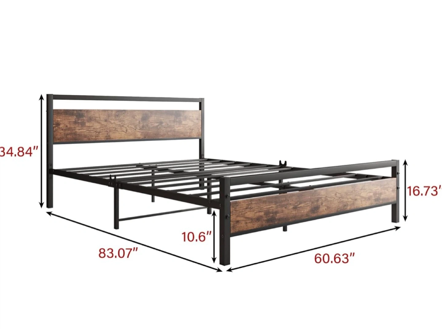 Still in the box: BOFENG Queen Bed Frame with Wood Headboard,Black Queen Size Bed Frames with Storage No Box Spring Needed,Metal Platform Bed Frame Queen Size Mattress Foundation,Strong Steel Slats,Noise Free,Brown
