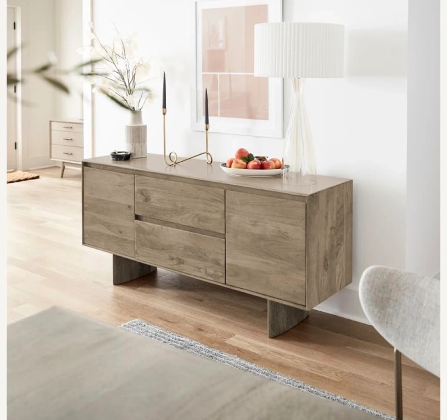 This table lamp features a unique clear glass bottle-shaped base. It's topped with a pleated, neutral-toned lampshade. The lamp provides a warm, diffused light. It's perfect for adding ambient lighting to a living room or bedroom.