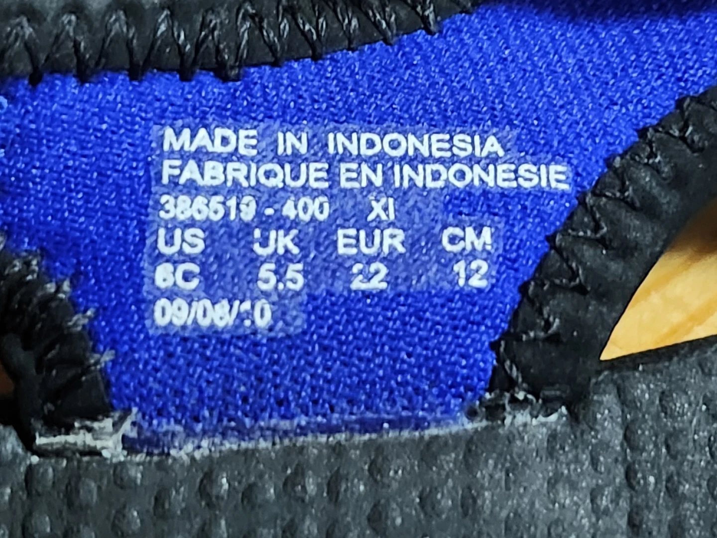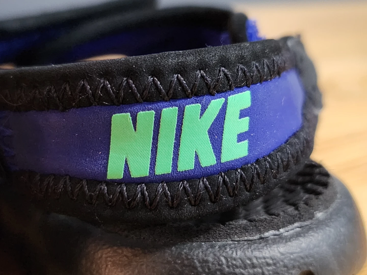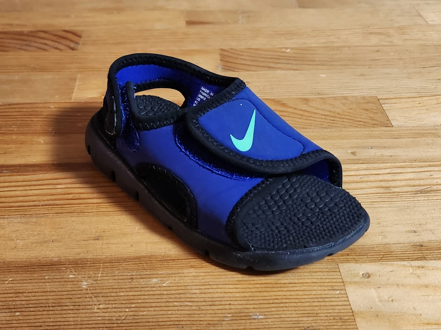 These toddler sandals are perfect for summer adventures! They are blue with a black sole and a velcro strap for easy on and off. The Nike swoosh is a nice touch.