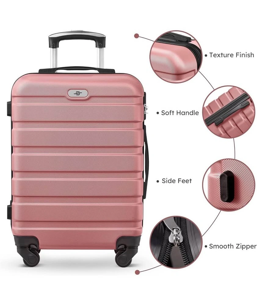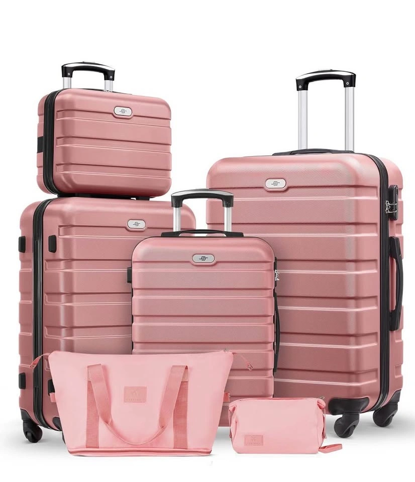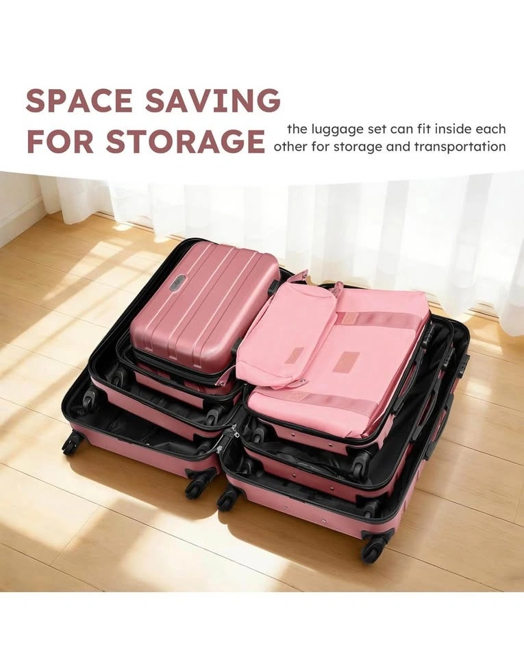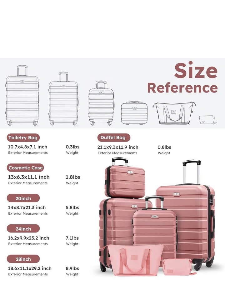 Brand new pink luggage set with 3 suitcases, toiletry bag, and duffel bag. The set has a textured finish, soft handle, side feet, and smooth zippers. The toiletry bag has an inner zip pocket and a back zip pocket. The duffel bag has comfortable straps and is water resistant. Available sizes are 20, 24, and 28 inches.