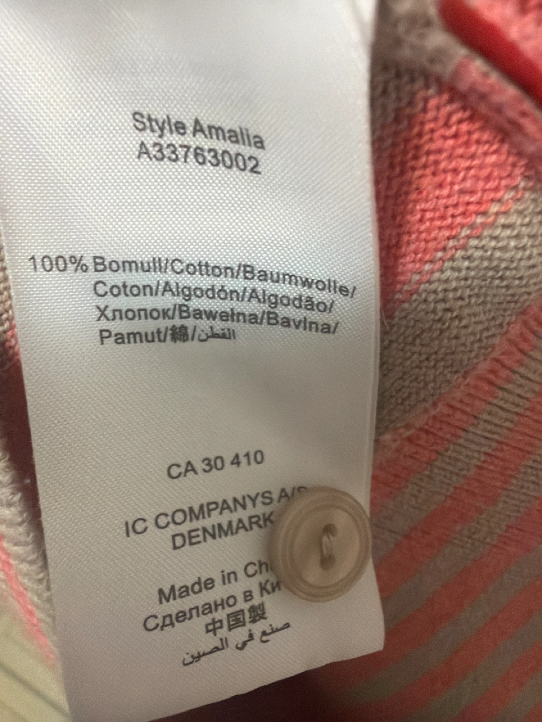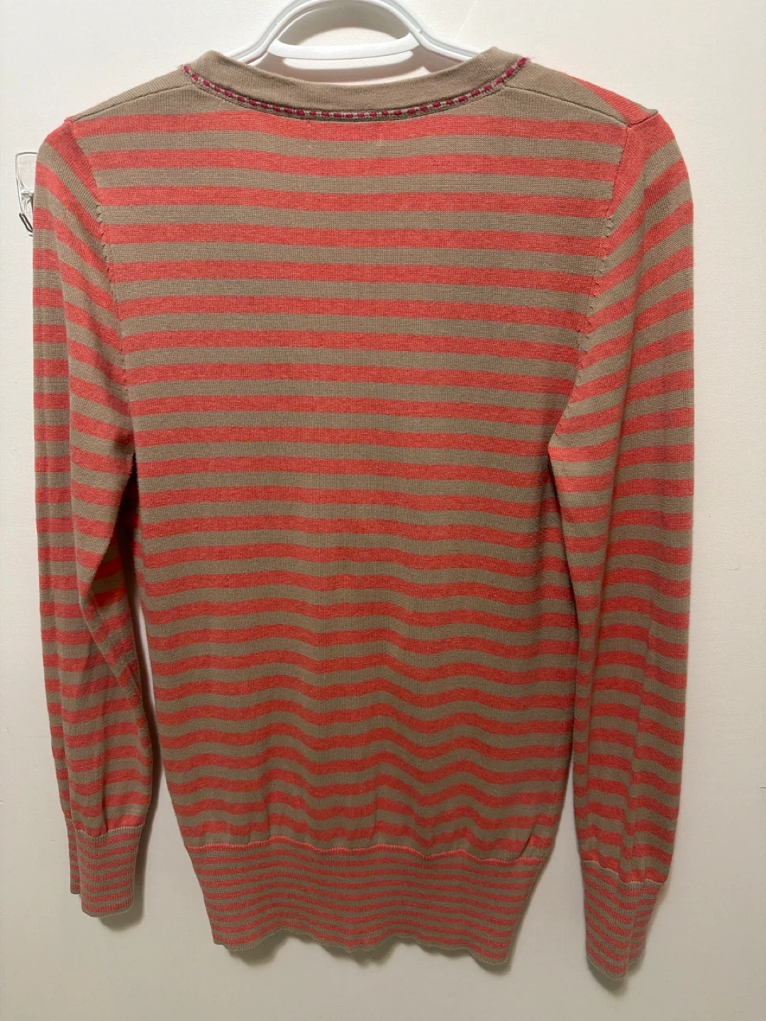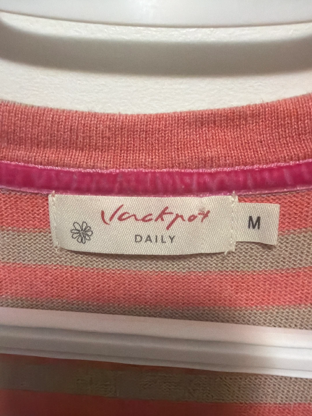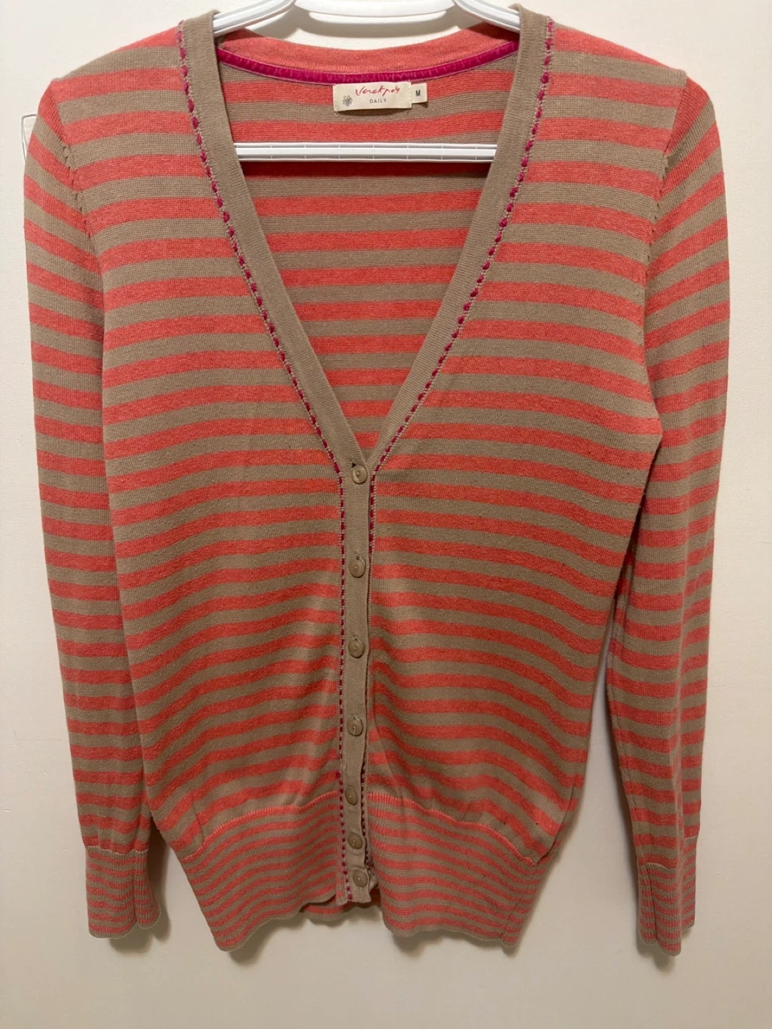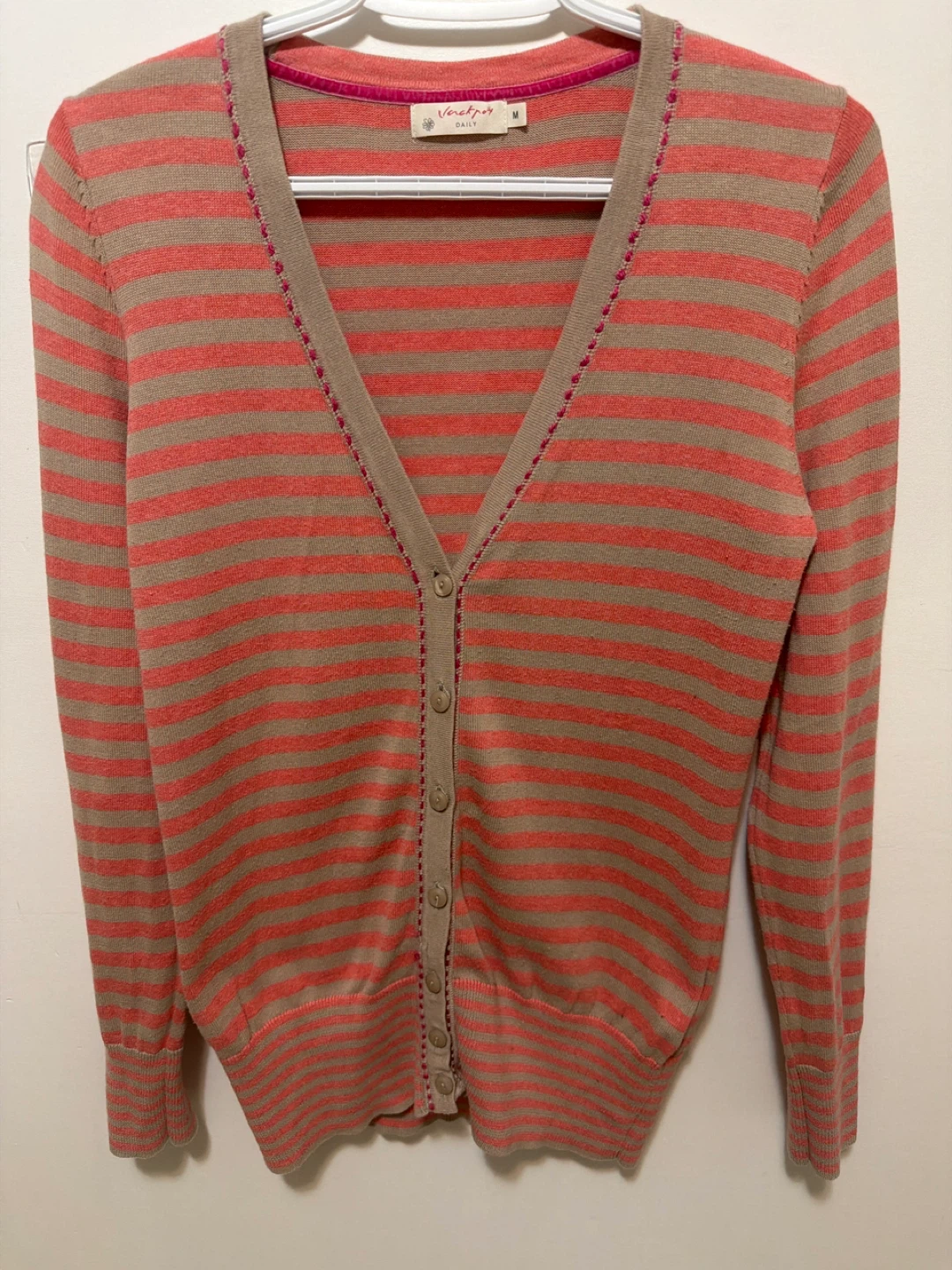 Here's a Jackpot Daily cardigan in size M! It features a lovely striped pattern in coral and beige. The material is 100% cotton, making it super comfy for everyday wear. It's in great condition and ready for a new home!