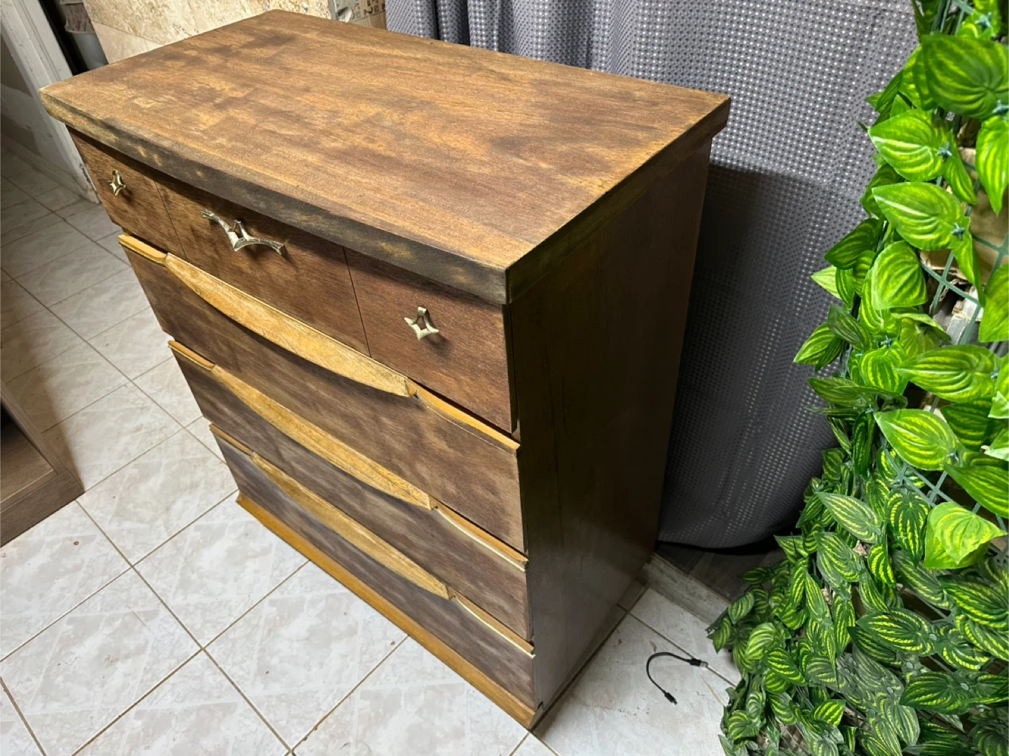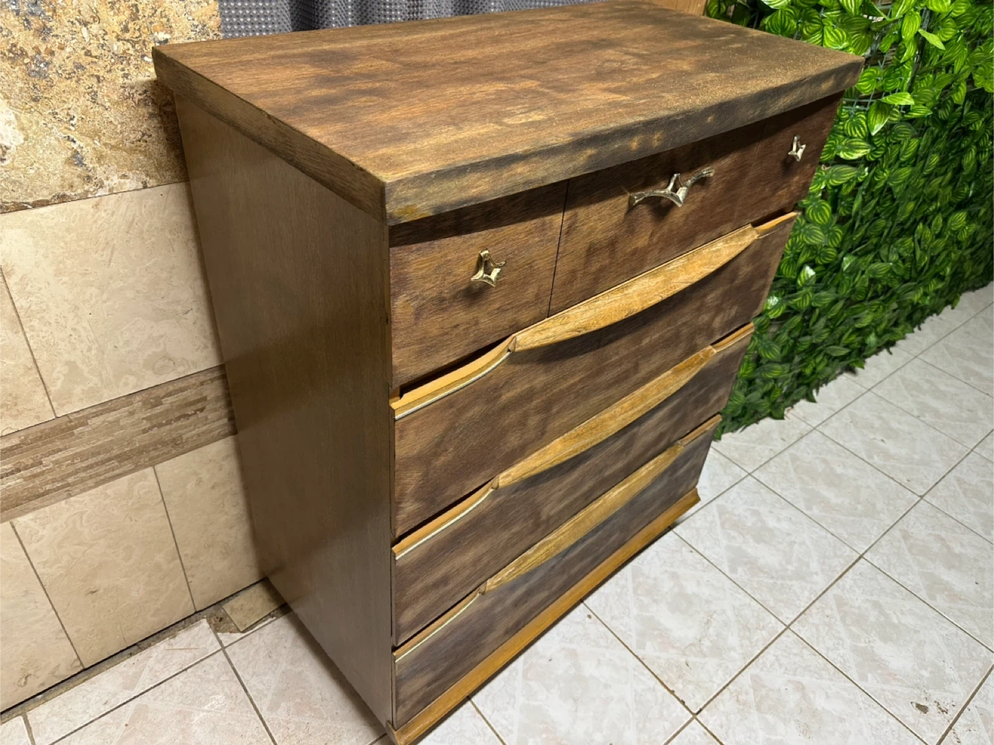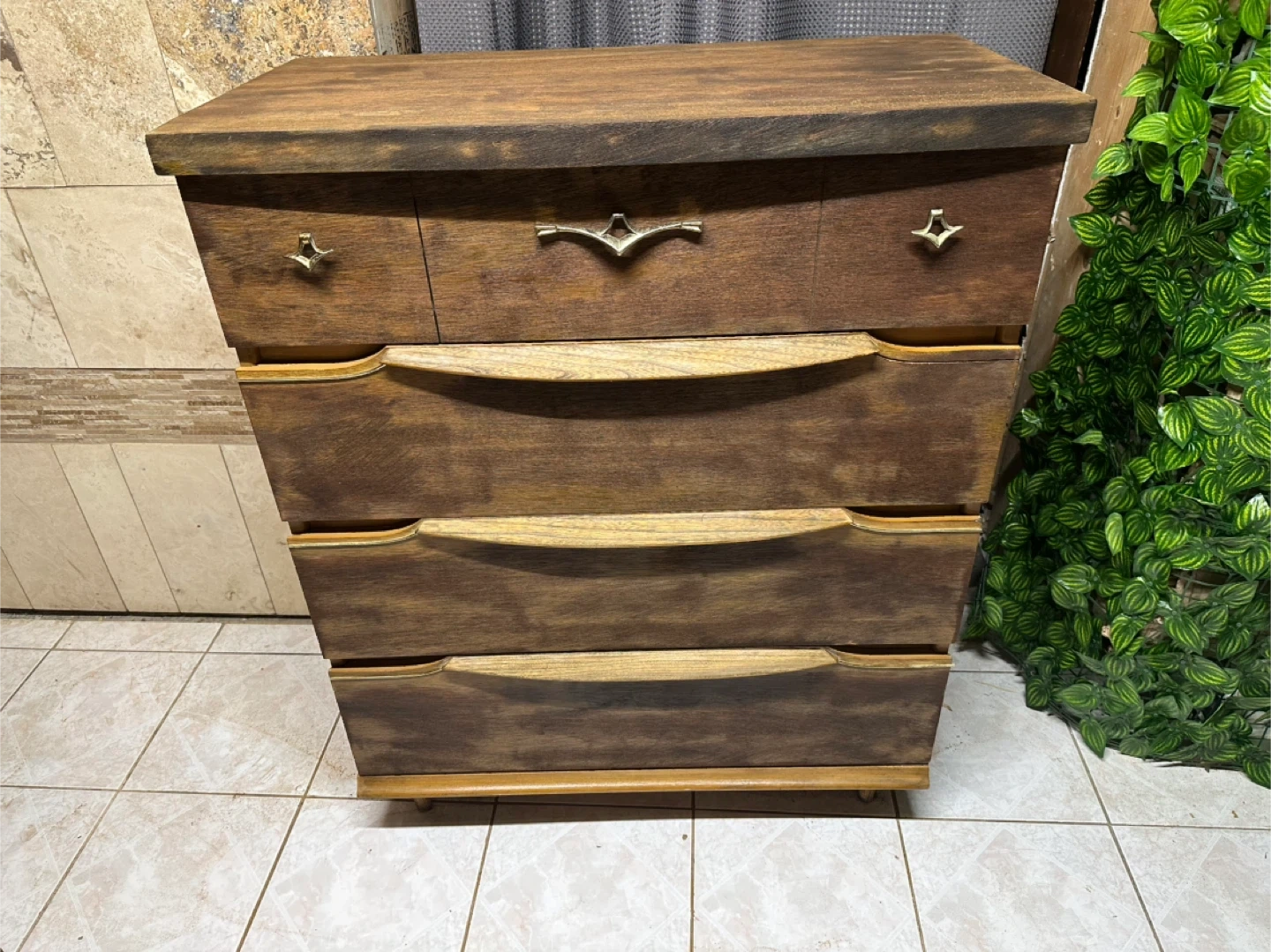 The dresser features a unique design with curved drawer fronts and decorative handles. It's in good condition and ready for a new home!