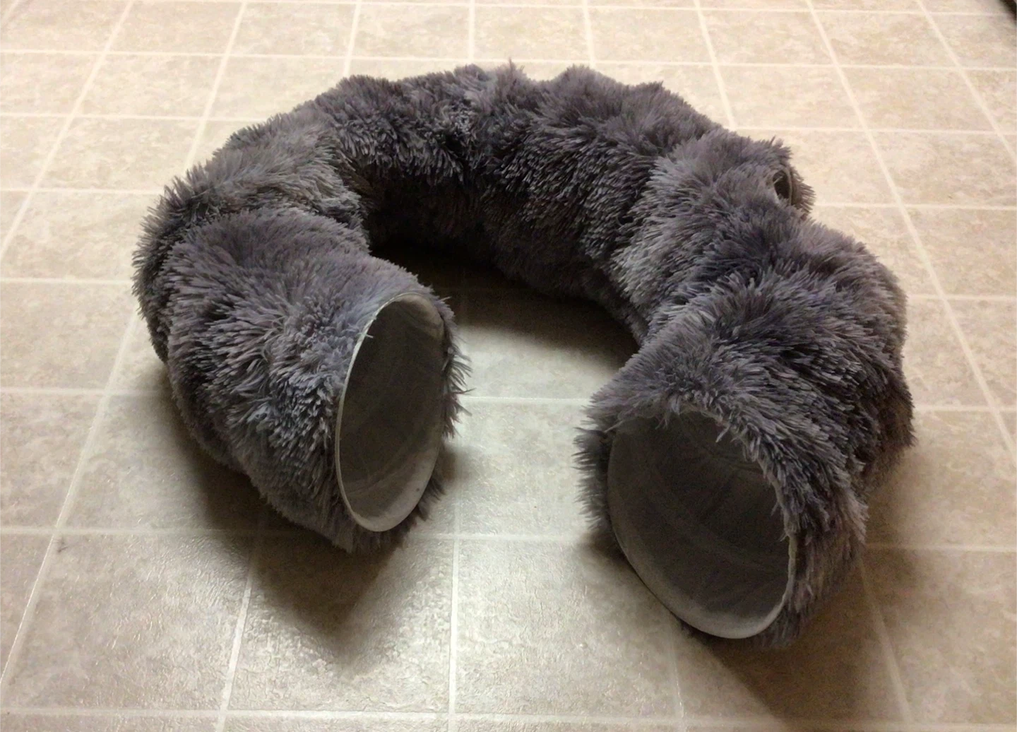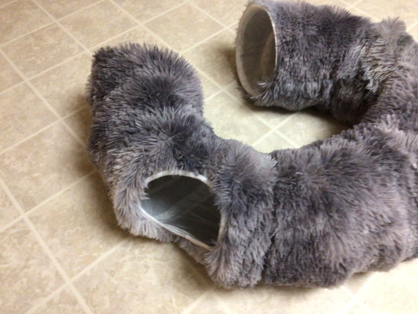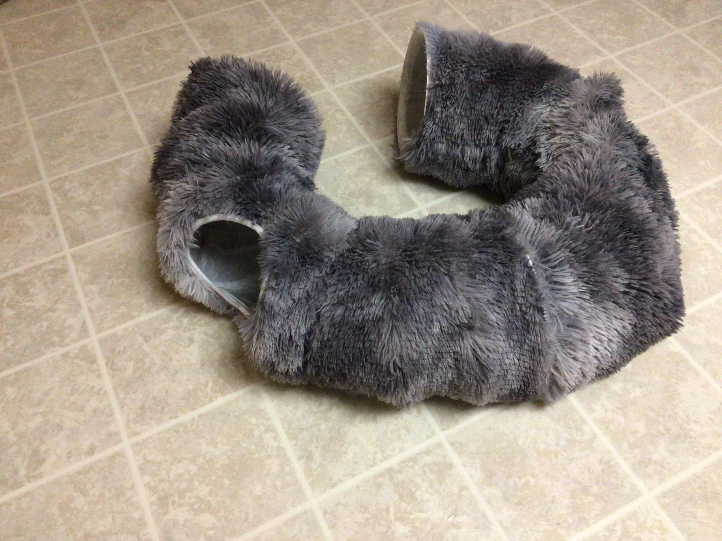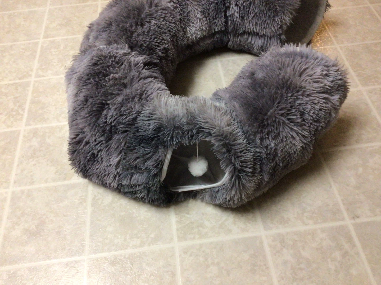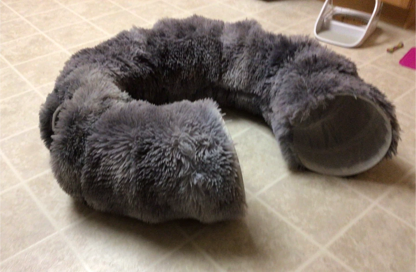 Selling a grey fuzzy cat tunnel toy. It's in great condition and ready for a new furry friend to enjoy! It's a fun and cozy way for your cat to play and explore, my cat is 13 and not too interested