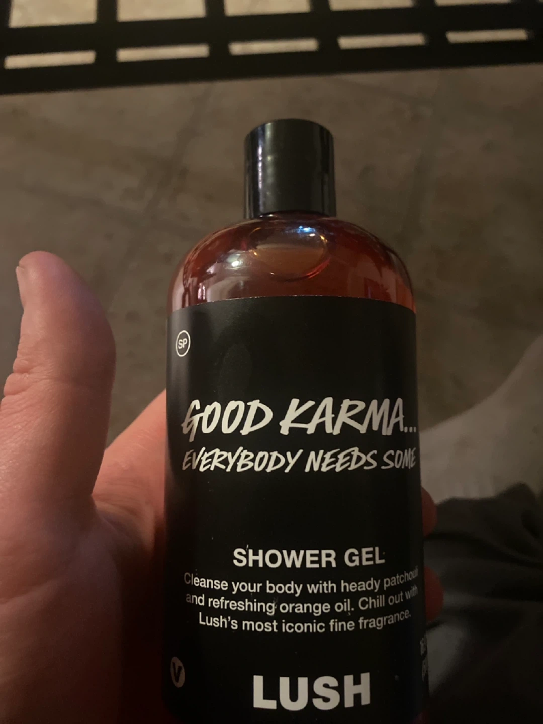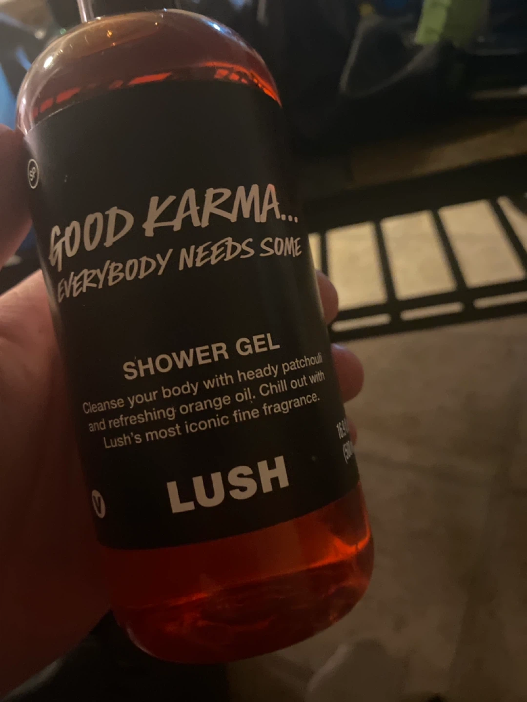 Selling a bottle of Lush Good Karma shower gel! It's a 500ml bottle with a lovely scent of heady patchouli and refreshing orange oil. It's a vegan self-preserving formula, perfect for a refreshing shower experience
