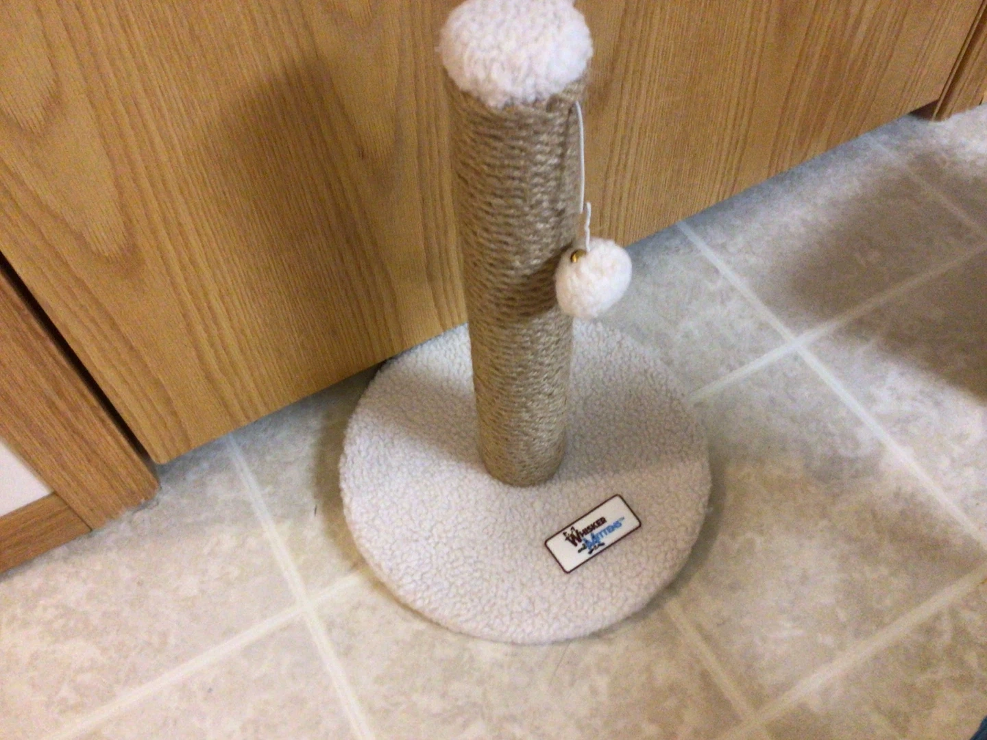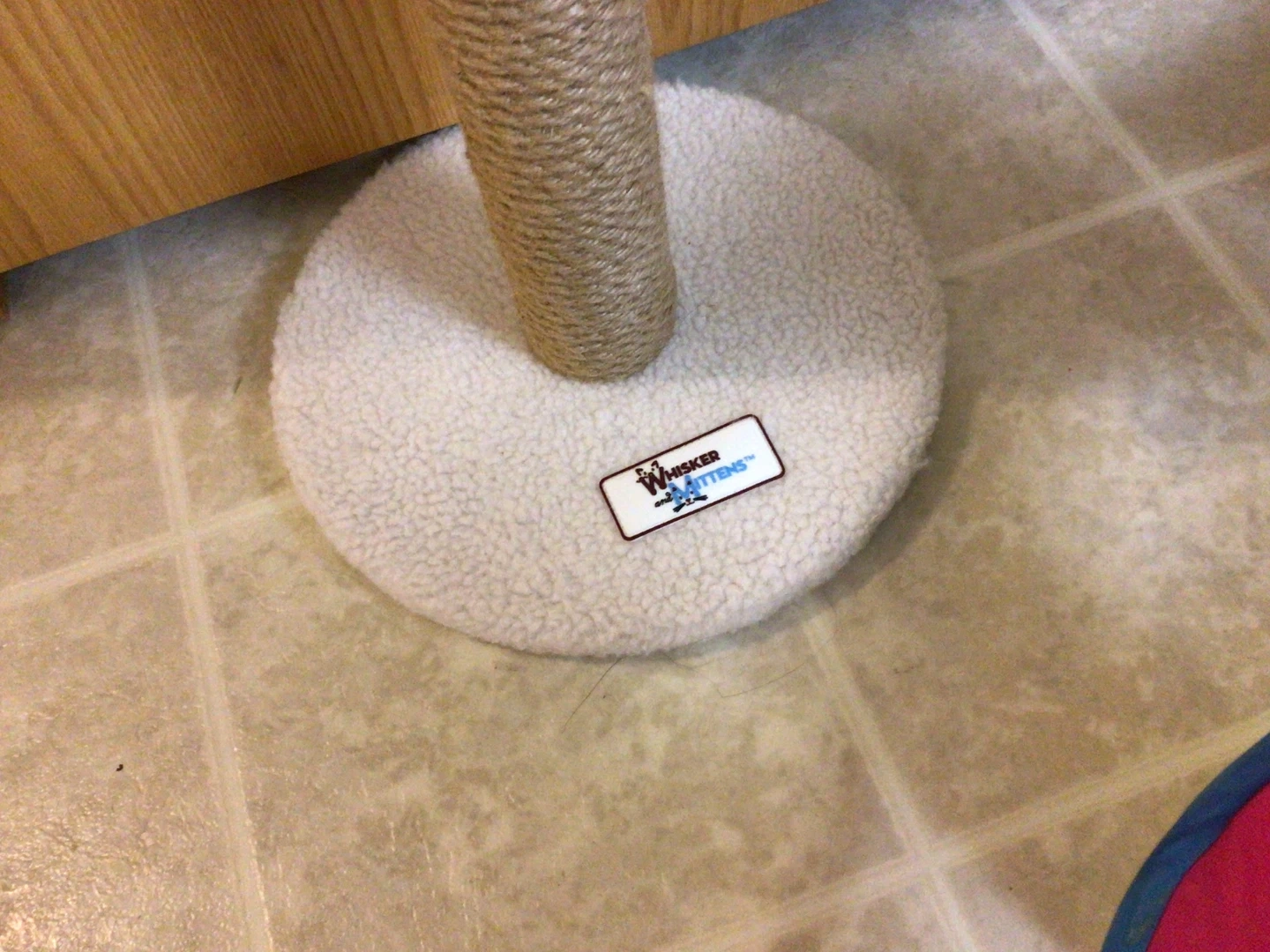 Selling a cat scratching post from Whiskers & Mittens! It's in great shape and ready for a new feline friend. The base and top are covered in a soft, plush material, and the post itself is wrapped in durable rope for scratching fun
