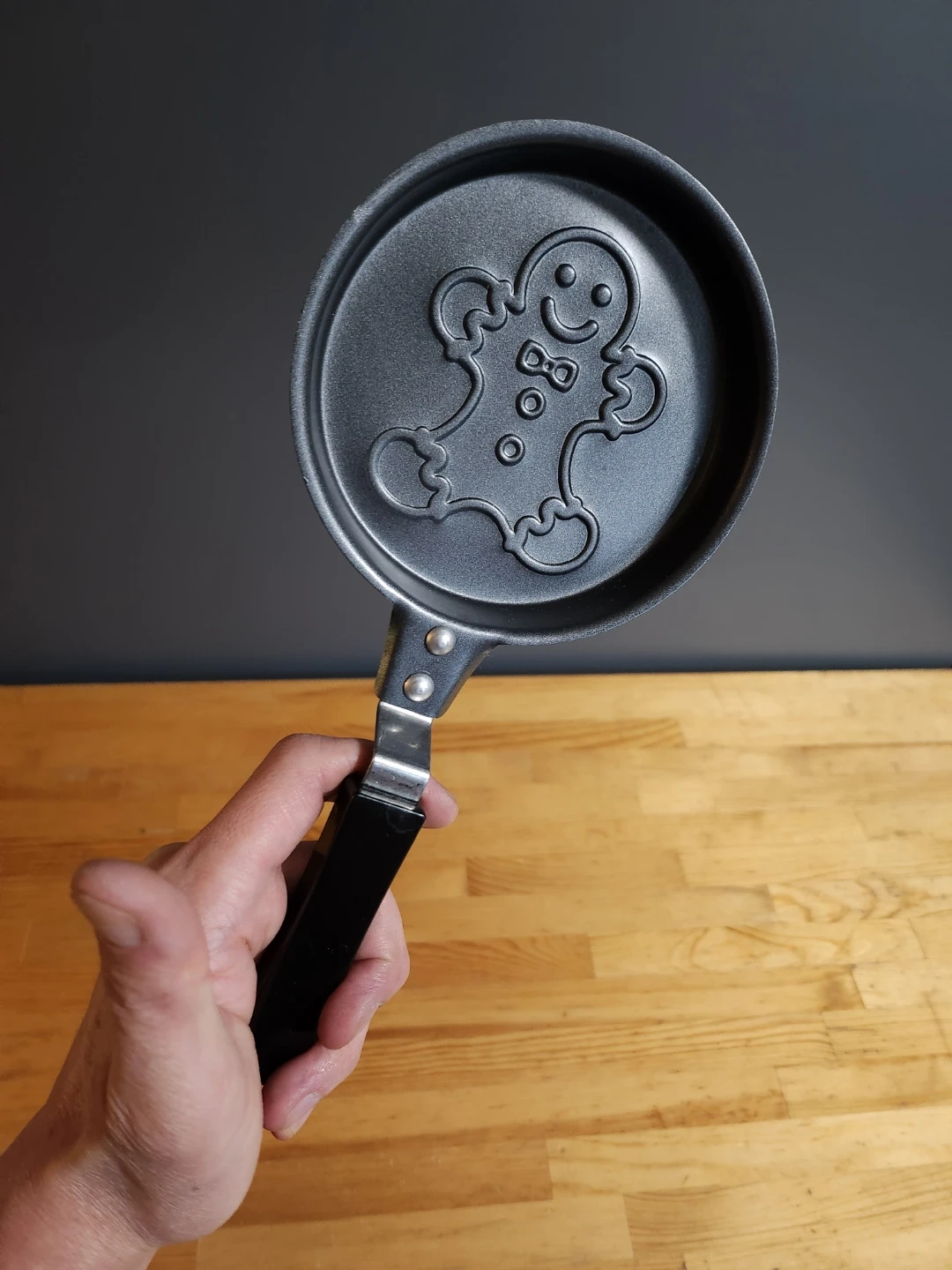 Non-stick pancake pan designed to cook a single pancake in the shape of a gingerbread man. Made from carbon steel with a non-stick coating. The pan features a low, flared rim for easy pancake removal.
