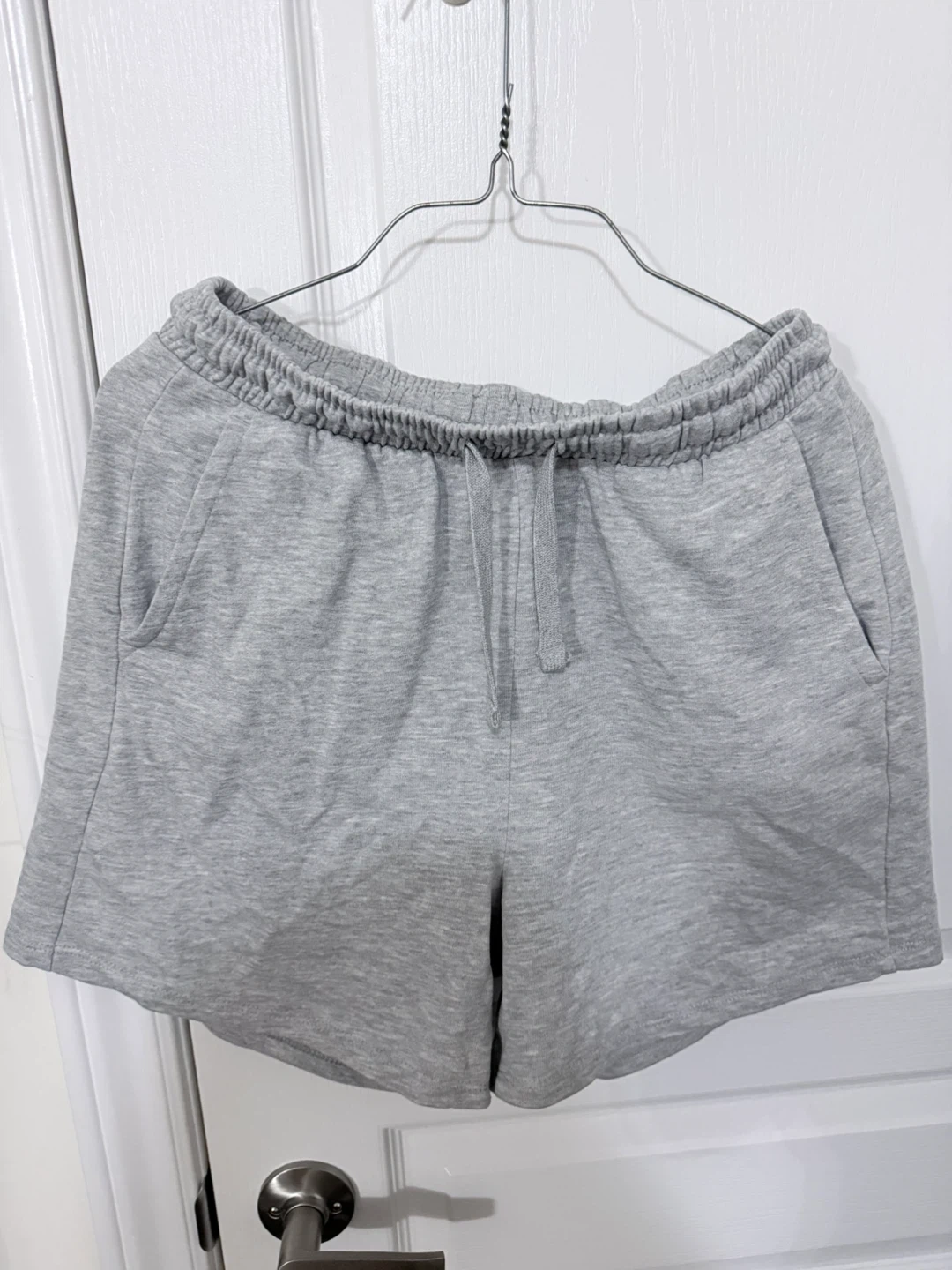Selling a pair of grey sweat shorts. They're in great condition and super comfy for lounging around the house or running errands. The shorts have a drawstring waist and pockets