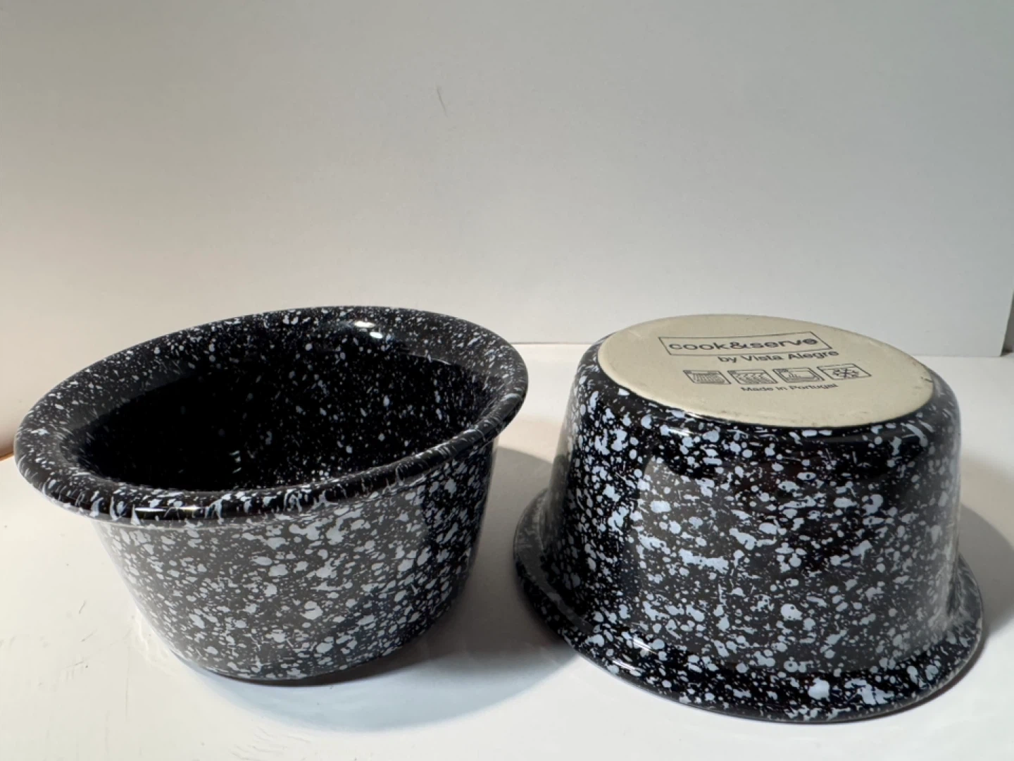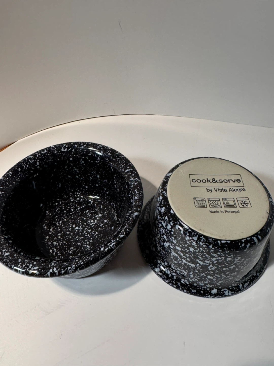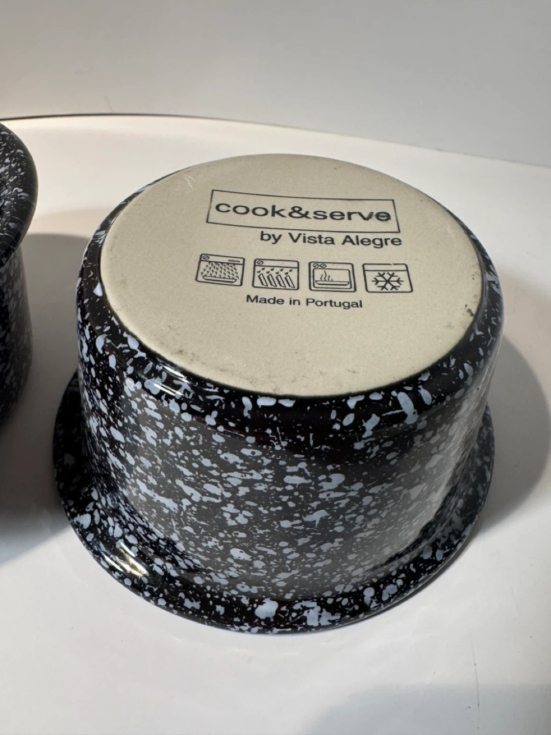 Vista Alegre "cook&serve" bowls. These dishes are made of porcelain, are designed for both cooking and serving, and are manufactured in Portugal. The specific black and white speckled pattern is a known style for this collection.