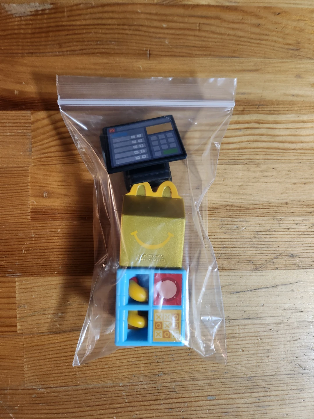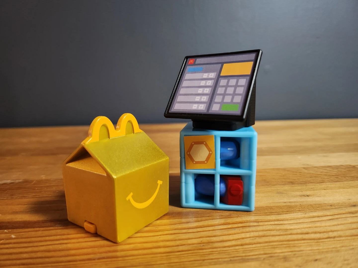 - Yellow Cube (Left): A miniature golden Happy Meal box.