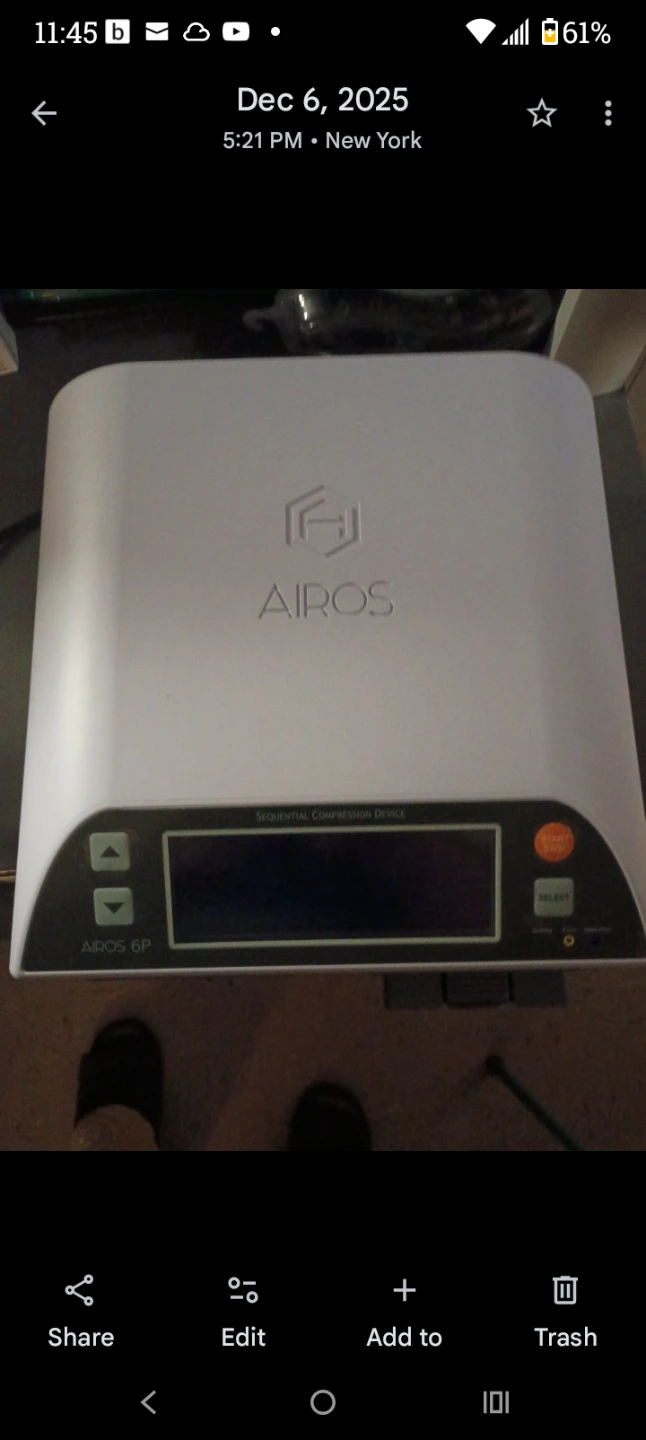 Selling an AIROS Model 6P sequential compression device. It's brand new never used, clean as a whistle This device is designed to help improve circulation and reduce swelling. Press start/stop to operate. The boots go to up to the thigh,