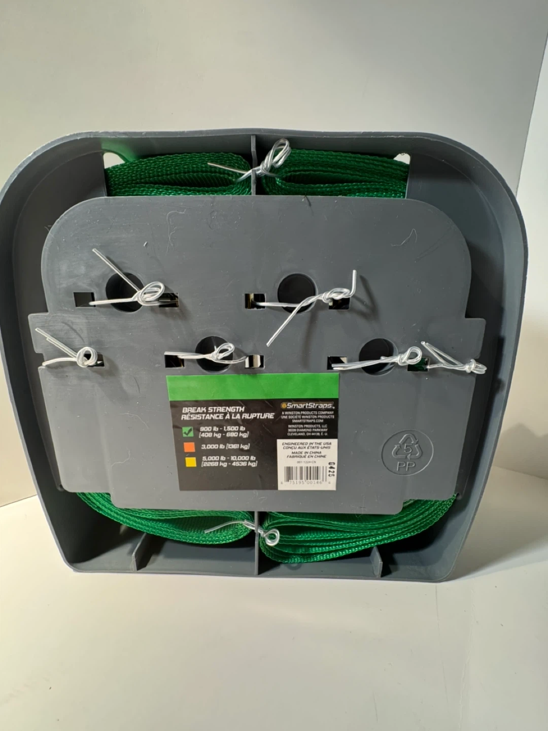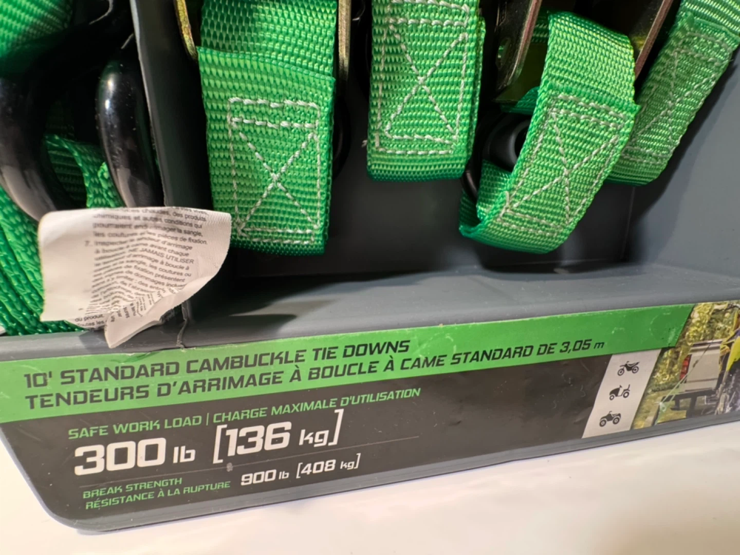 BRAND NEW pack of 4 SmartStraps cam buckle tie downs. They are 10 feet long each, or 3.05 meters. Each strap has a safe work load of 300 lbs (136 kg) and a break strength of 900 lbs (408 kg). Great for securing items!